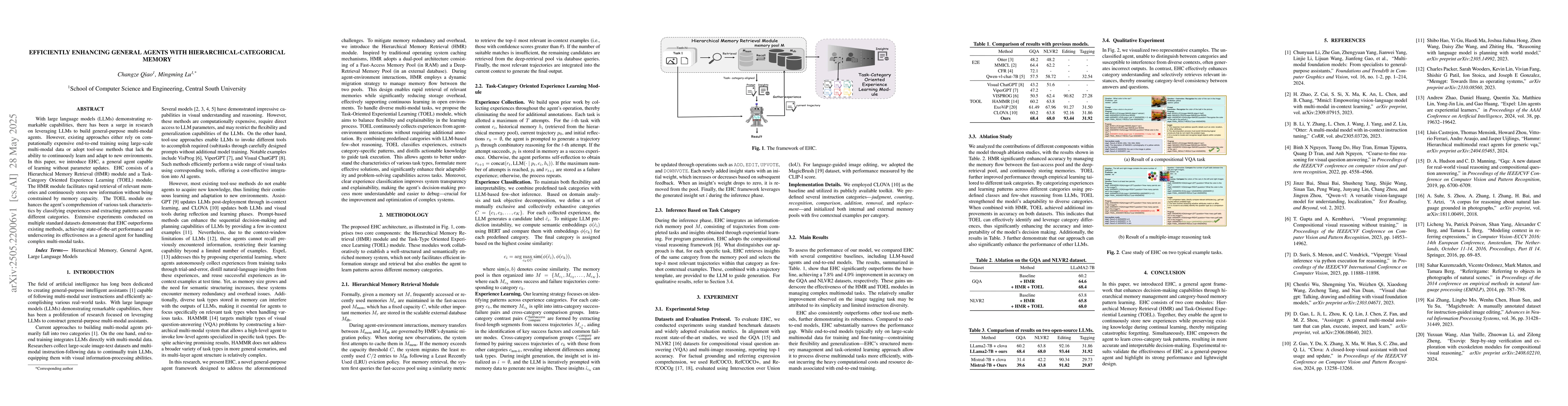 A new general agent called EHC uses hierarchical memory retrieval and task-category oriented experience learning to handle complex multi-modal tasks without requiring parameter updates. It outperforms existing methods in experiments on multiple datasets.