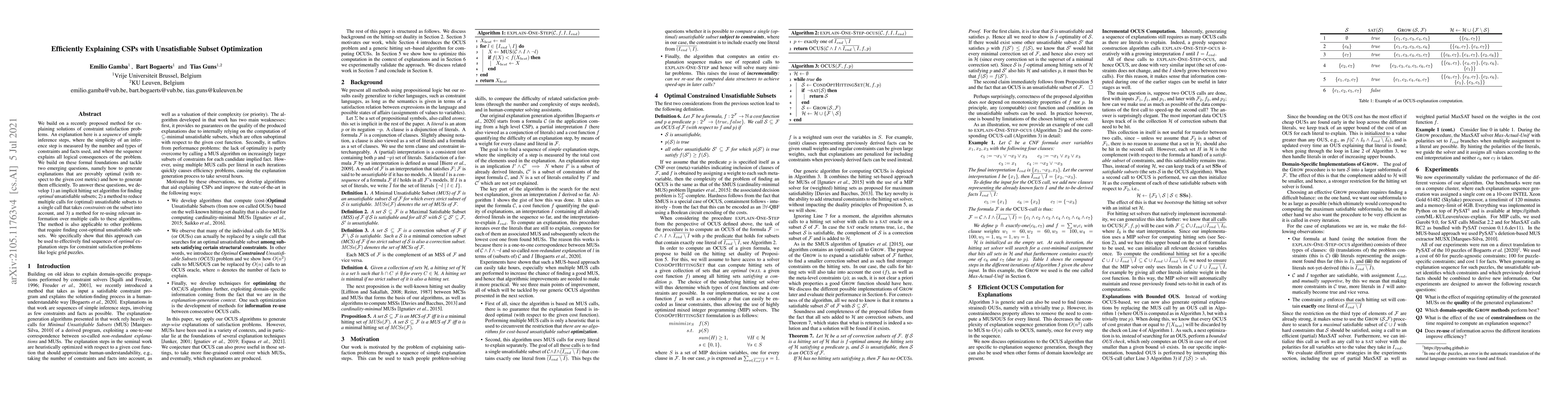 We build on a recently proposed method for explaining solutions of constraint satisfaction problems. An explanation here is a sequence of simple inference steps, where the simplicity of an inference step is measured by the number and types of constraints and facts used, and where the sequence explains all logical consequences of the problem. We build on these formal foundations and tackle two emerging questions, namely how to generate explanations that are provably optimal (with respect to the given cost metric) and how to generate them efficiently. To answer these questions, we develop 1) an implicit hitting set algorithm for finding optimal unsatisfiable subsets; 2) a method to reduce multiple calls for (optimal) unsatisfiable subsets to a single call that takes constraints on the subset into account, and 3) a method for re-using relevant information over multiple calls to these algorithms. The method is also applicable to other problems that require finding cost-optimal unsatiable subsets. We specifically show that this approach can be used to effectively find sequences of optimal explanation steps for constraint satisfaction problems like logic grid puzzles.