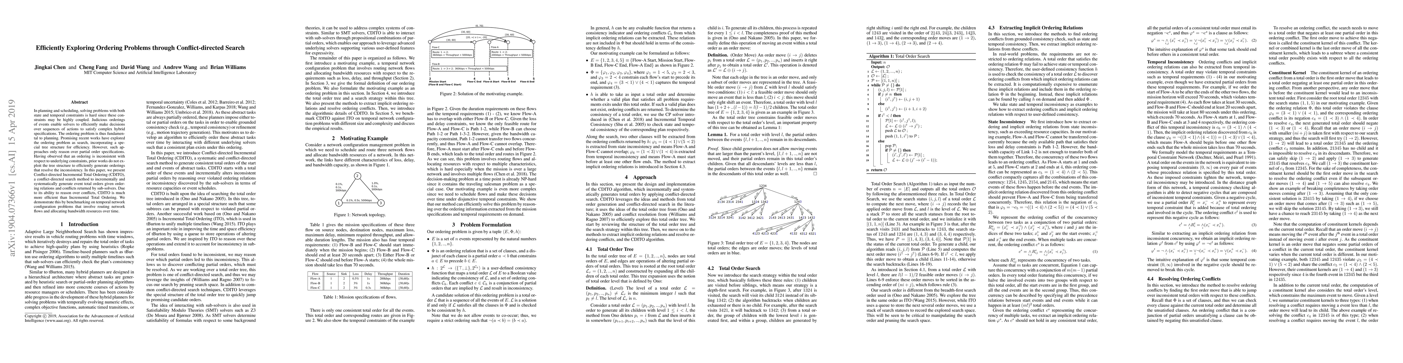 In planning and scheduling, solving problems with both state and temporal constraints is hard since these constraints may be highly coupled. Judicious orderings of events enable solvers to efficiently make decisions over sequences of actions to satisfy complex hybrid specifications. The ordering problem is thus fundamental to planning. Promising recent works have explored the ordering problem as search, incorporating a special tree structure for efficiency. However, such approaches only reason over partial order specifications. Having observed that an ordering is inconsistent with respect to underlying constraints, prior works do not exploit the tree structure to efficiently generate orderings that resolve the inconsistency. In this paper, we present Conflict-directed Incremental Total Ordering (CDITO), a conflict-directed search method to incrementally and systematically generate event total orders given ordering relations and conflicts returned by sub-solvers. Due to its ability to reason over conflicts, CDITO is much more efficient than Incremental Total Ordering. We demonstrate this by benchmarking on temporal network configuration problems that involve routing network flows and allocating bandwidth resources over time.