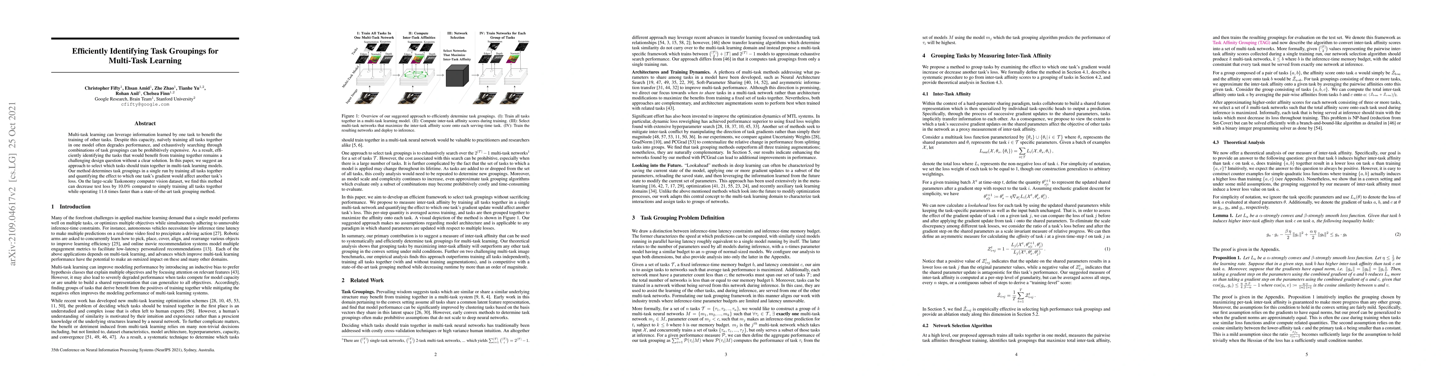 This paper proposes an efficient method for identifying optimal task groupings in multi-task learning to improve performance while minimizing computational costs. The approach trains all tasks together and measures gradient impact to determine beneficial groupings, achieving a 10.0% reduction in test loss and operating 11.6 times faster than existing methods.
