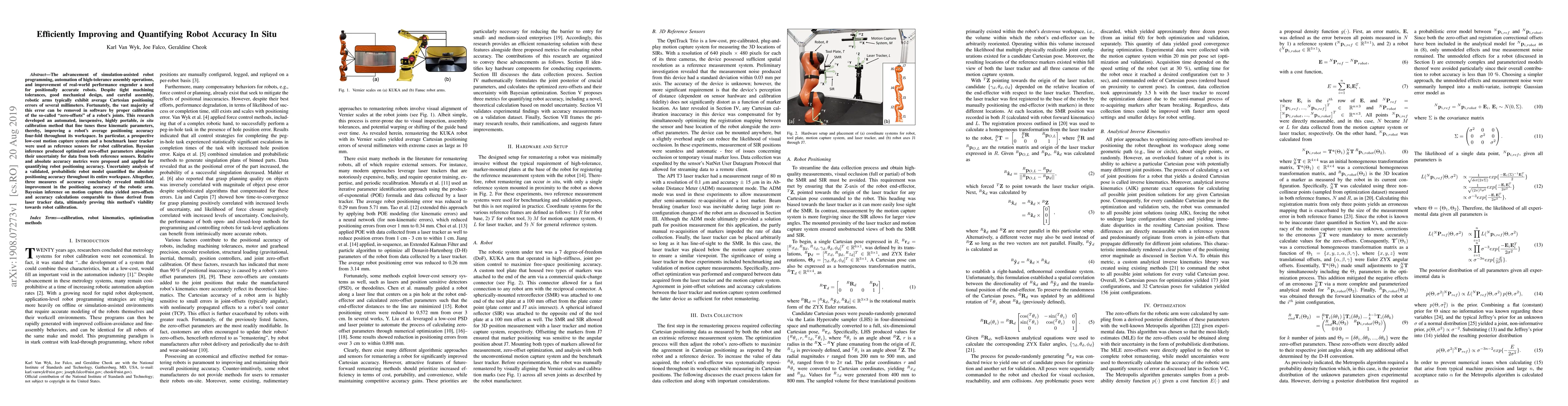 The advancement of simulation-assisted robot programming, automation of high-tolerance assembly operations, and improvement of real-world performance engender a need for positionally accurate robots. Despite tight machining tolerances, good mechanical design, and careful assembly, robotic arms typically exhibit average Cartesian positioning errors of several millimeters. Fortunately, the vast majority of this error can be removed in software by proper calibration of the so-called "zero-offsets" of a robot's joints. This research developed an automated, inexpensive, highly portable, in situ calibration method that fine tunes these kinematic parameters, thereby, improving a robot's average positioning accuracy four-fold throughout its workspace. In particular, a prospective low-cost motion capture system and a benchmark laser tracker were used as reference sensors for robot calibration. Bayesian inference produced optimized zero-offset parameters alongside their uncertainty for data from both reference sensors. Relative and absolute accuracy metrics were proposed and applied for quantifying robot positioning accuracy. Uncertainty analysis of a validated, probabilistic robot model quantified the absolute positioning accuracy throughout its entire workspace. Altogether, three measures of accuracy conclusively revealed multi-fold improvement in the positioning accuracy of the robotic arm. Bayesian inference on motion capture data yielded zero-offsets and accuracy calculations comparable to those derived from laser tracker data, ultimately proving this method's viability towards robot calibration.