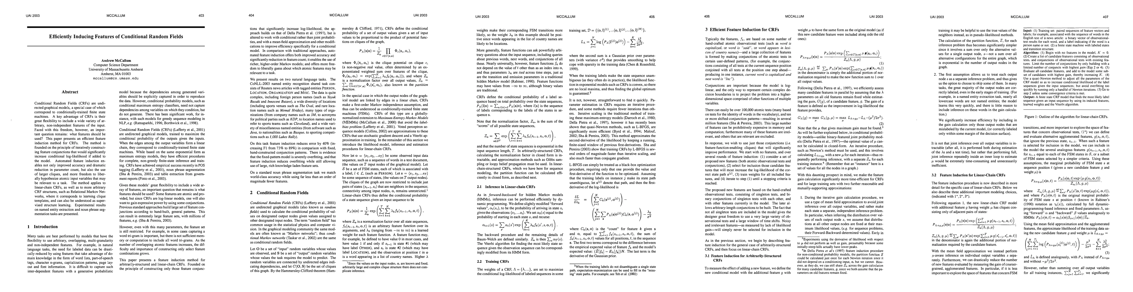 Conditional Random Fields (CRFs) are undirected graphical models, a special case of which correspond to conditionally-trained finite state machines. A key advantage of these models is their great flexibility to include a wide array of overlapping, multi-granularity, non-independent features of the input. In face of this freedom, an important question that remains is, what features should be used? This paper presents a feature induction method for CRFs. Founded on the principle of constructing only those feature conjunctions that significantly increase log-likelihood, the approach is based on that of Della Pietra et al [1997], but altered to work with conditional rather than joint probabilities, and with additional modifications for providing tractability specifically for a sequence model. In comparison with traditional approaches, automated feature induction offers both improved accuracy and more than an order of magnitude reduction in feature count; it enables the use of richer, higher-order Markov models, and offers more freedom to liberally guess about which atomic features may be relevant to a task. The induction method applies to linear-chain CRFs, as well as to more arbitrary CRF structures, also known as Relational Markov Networks [Taskar & Koller, 2002]. We present experimental results on a named entity extraction task.