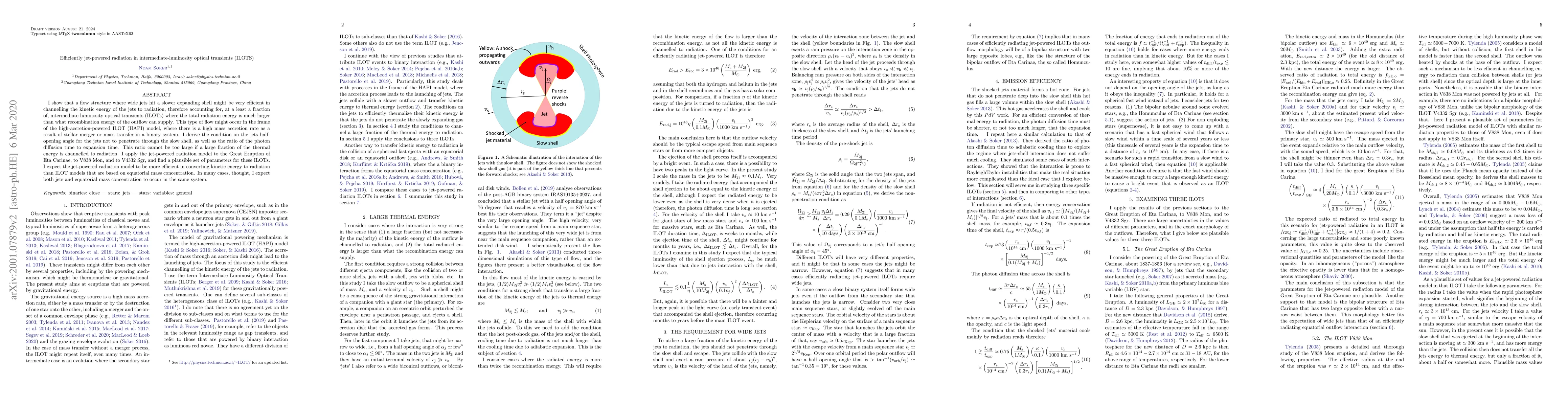 I show that a flow structure where wide jets hit a slower expanding shell might be very efficient in channelling the kinetic energy of the jets to radiation, therefore accounting for, at a least a fraction of, intermediate luminosity optical transients (ILOTs) where the total radiation energy is much larger than what recombination energy of the outflow can supply. This type of flow might occur in the frame of the high-accretion-powered ILOT (HAPI) model, where there is a high mass accretion rate as a result of stellar merger or mass transfer in a binary system. I derive the condition on the jets half-opening angle for the jets not to penetrate through the slow shell, as well as the ratio of the photon diffusion time to expansion time. This ratio cannot be too large if a large fraction of the thermal energy is channelled to radiation. I apply the jet-powered radiation model to the Great Eruption of Eta Carinae, to V838~Mon, and to V4332~Sgr, and find a plausible set of parameters for these ILOTs. I expect the jet-powered radiation model to be more efficient in converting kinetic energy to radiation than ILOT models that are based on equatorial mass concentration. In many cases, thought, I expect both jets and equatorial mass concentration to occur in the same system.