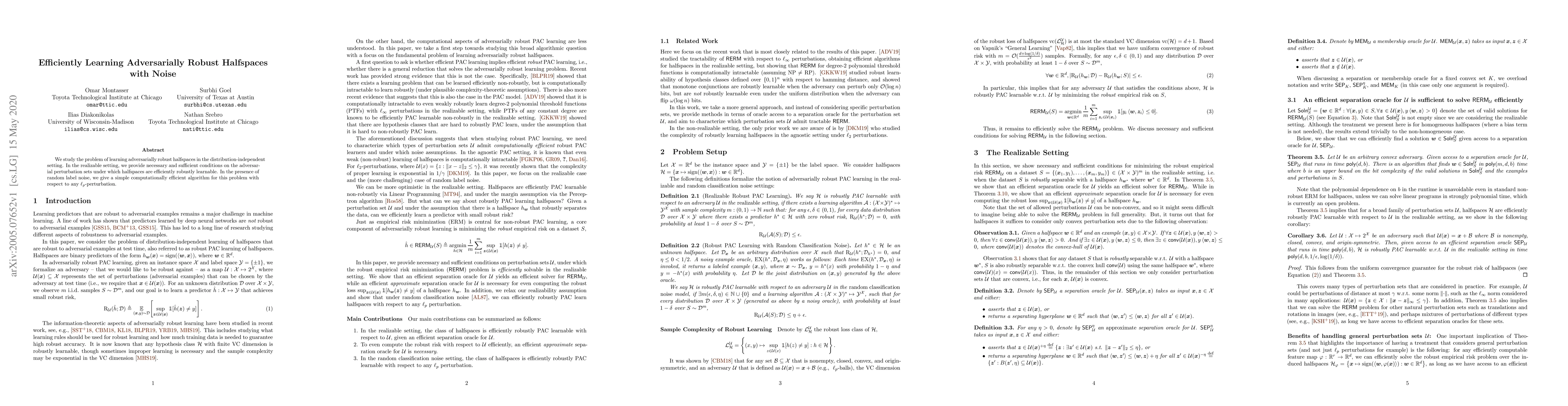 This paper addresses the challenge of learning robust halfspaces under adversarial perturbations in a distribution-independent context. It presents necessary and sufficient conditions for efficient learning in the realizable setting and proposes a noise-tolerant algorithm for scenarios with random label noise.