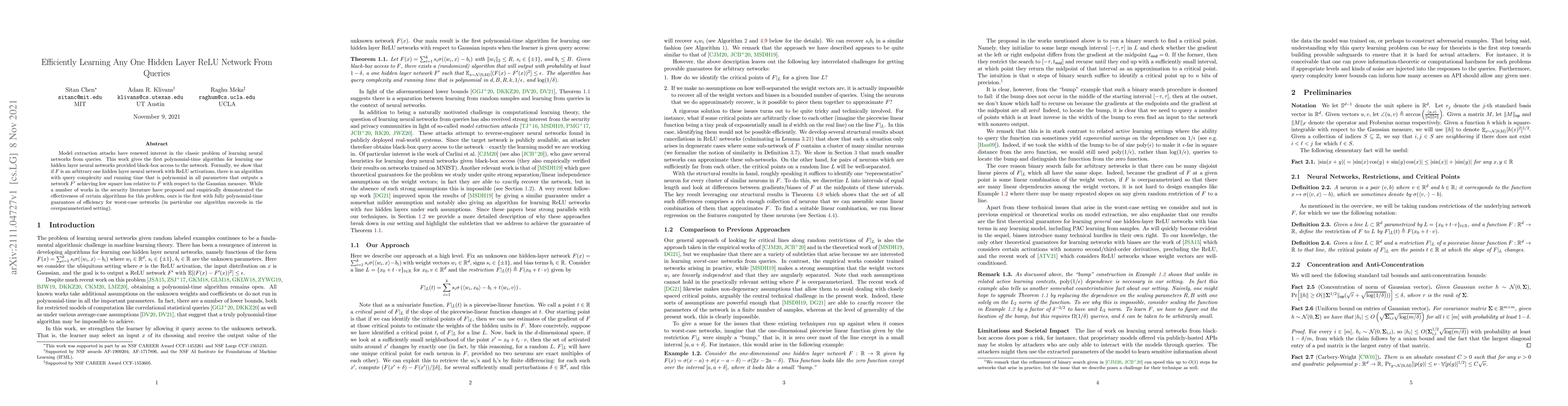 This paper presents the first polynomial-time algorithm for learning any one hidden layer neural network with ReLU activations using black-box queries. The algorithm achieves low square loss relative to the original network, providing the first fully polynomial-time efficiency guarantees even for worst-case, overparameterized networks.