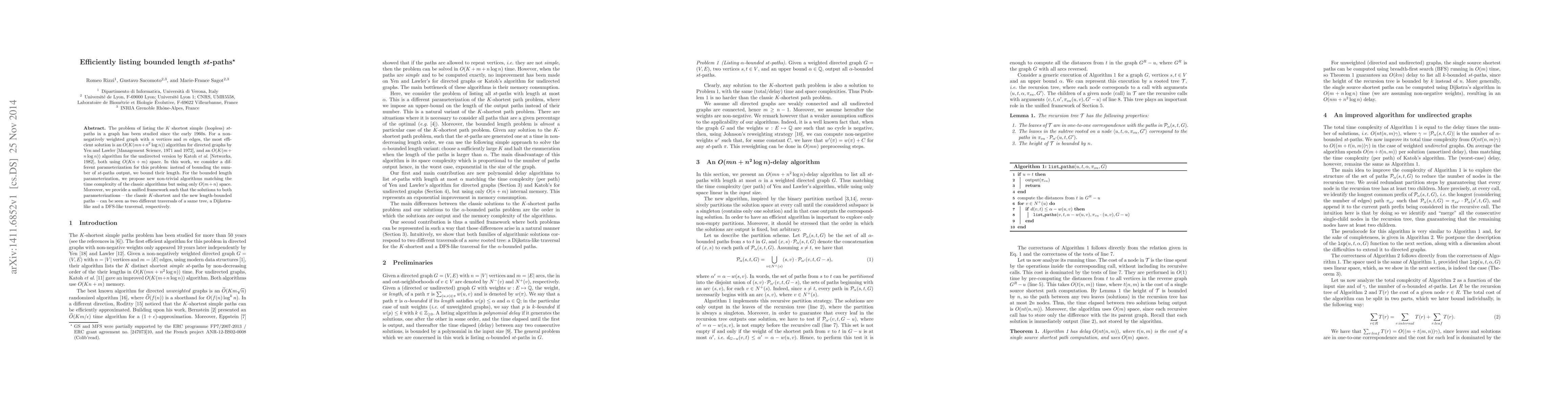 This paper proposes efficient algorithms for listing bounded length $st$-paths in weighted graphs, achieving the same time complexity as classic $K$-shortest path algorithms but using only $O(m+n)$ space. It also introduces a unified framework to view both $K$-shortest and length-bounded path solutions as different traversals of a common tree structure.