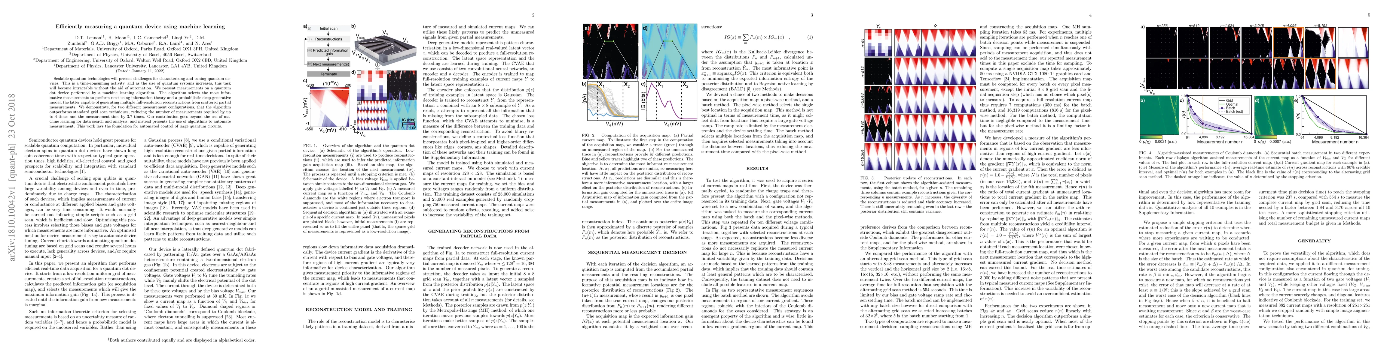 Scalable quantum technologies will present challenges for characterizing and tuning quantum devices. This is a time-consuming activity, and as the size of quantum systems increases, this task will become intractable without the aid of automation. We present measurements on a quantum dot device performed by a machine learning algorithm. The algorithm selects the most informative measurements to perform next using information theory and a probabilistic deep-generative model, the latter capable of generating multiple full-resolution reconstructions from scattered partial measurements. We demonstrate, for two different measurement configurations, that the algorithm outperforms standard grid scan techniques, reducing the number of measurements required by up to 4 times and the measurement time by 3.7 times. Our contribution goes beyond the use of machine learning for data search and analysis, and instead presents the use of algorithms to automate measurement. This work lays the foundation for automated control of large quantum circuits.