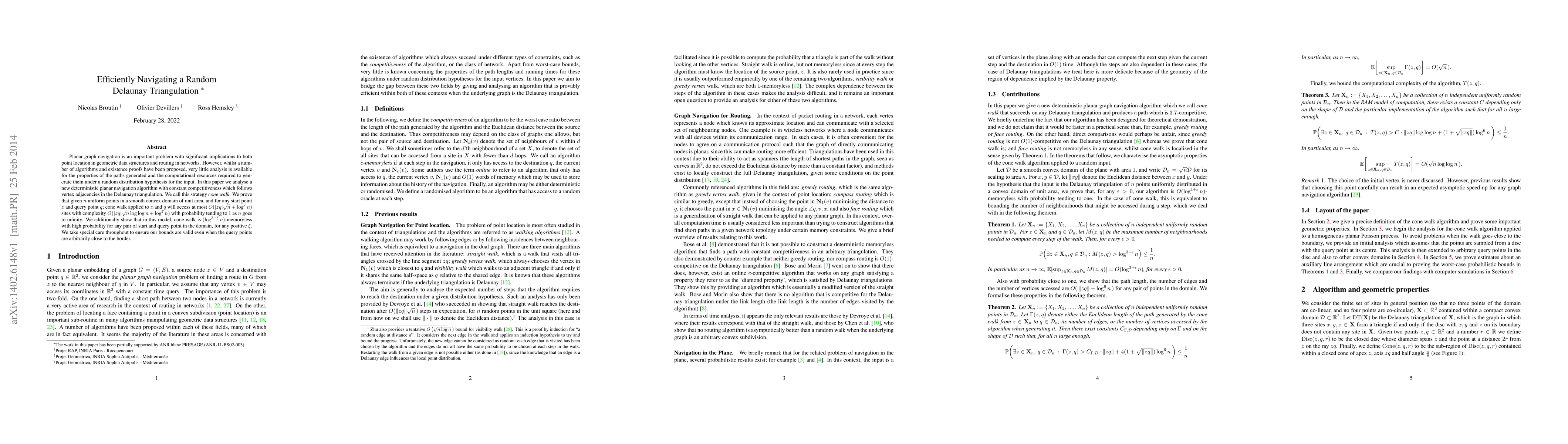Planar graph navigation is an important problem with significant implications to both point location in geometric data structures and routing in networks. However, whilst a number of algorithms and existence proofs have been proposed, very little analysis is available for the properties of the paths generated and the computational resources required to generate them under a random distribution hypothesis for the input. In this paper we analyse a new deterministic planar navigation algorithm with constant competitiveness which follows vertex adjacencies in the Delaunay triangulation. We call this strategy cone walk. We prove that given $n$ uniform points in a smooth convex domain of unit area, and for any start point $z$ and query point $q$; cone walk applied to $z$ and $q$ will access at most $O(|zq|\sqrt{n} +\log^7 n)$ sites with complexity $O(|zq|\sqrt{n} \log \log n + \log^7 n)$ with probability tending to 1 as $n$ goes to infinity. We additionally show that in this model, cone walk is $(\log ^{3+\xi} n)$-memoryless with high probability for any pair of start and query point in the domain, for any positive $\xi$. We take special care throughout to ensure our bounds are valid even when the query points are arbitrarily close to the border.