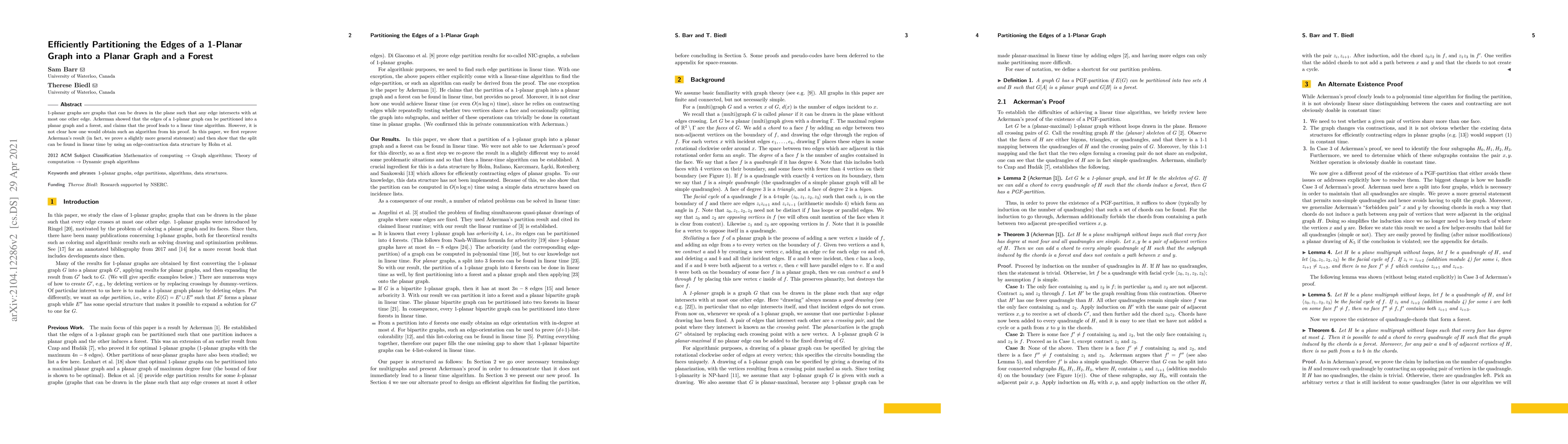 This paper reproves Ackerman's theorem on partitioning the edges of a 1-planar graph into a planar subgraph and a forest, and demonstrates a linear time algorithm for this partition using an edge-contraction data structure.