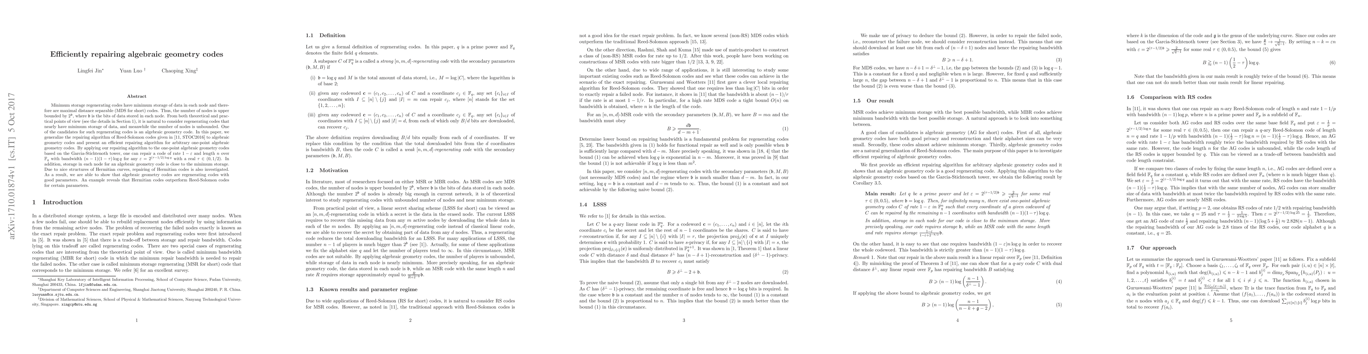 This paper proposes an efficient repairing algorithm for one-point algebraic geometry codes, generalizing the method used for Reed-Solomon codes. The algorithm allows for repairing algebraic geometry codes with storage close to the minimum while achieving a bandwidth of $(n-1)(1-\Gt)\log q$, demonstrating that these codes can serve as efficient regenerating codes with good parameters, especially Hermitian codes which outperform Reed-Solomon codes for certain configurations.