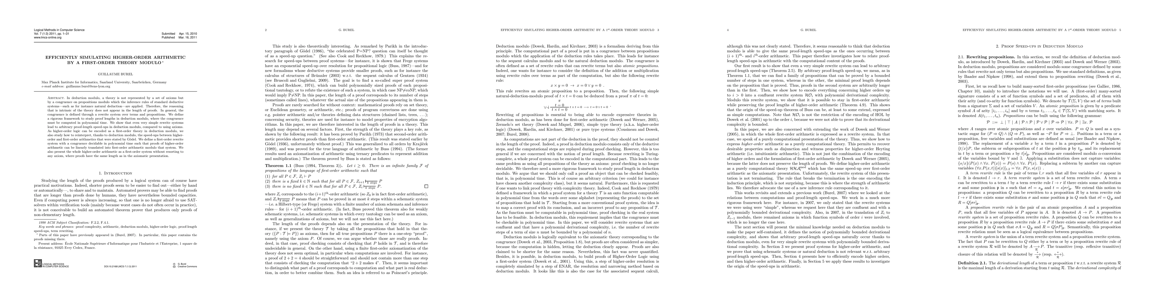 This paper introduces a framework for deduction modulo where congruences replace axioms, leading to efficient simulation of higher-order arithmetic by a first-order theory. It defines a polynomial-time computable congruence that translates higher-order proofs into first-order proofs without length penalty.