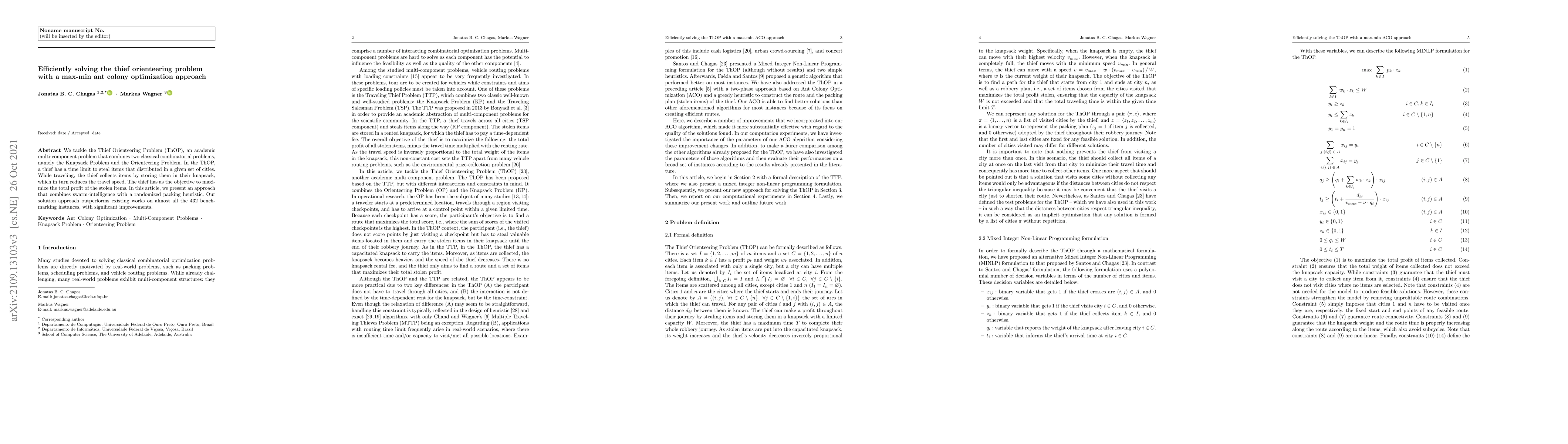 This paper proposes a novel Max-Min Ant Colony Optimization approach to solve the Thief Orienteering Problem (ThOP), combining the Knapsack and Orienteering Problems. The method integrates swarm intelligence with a randomized packing heuristic, achieving superior performance on 432 benchmark instances compared to existing solutions.