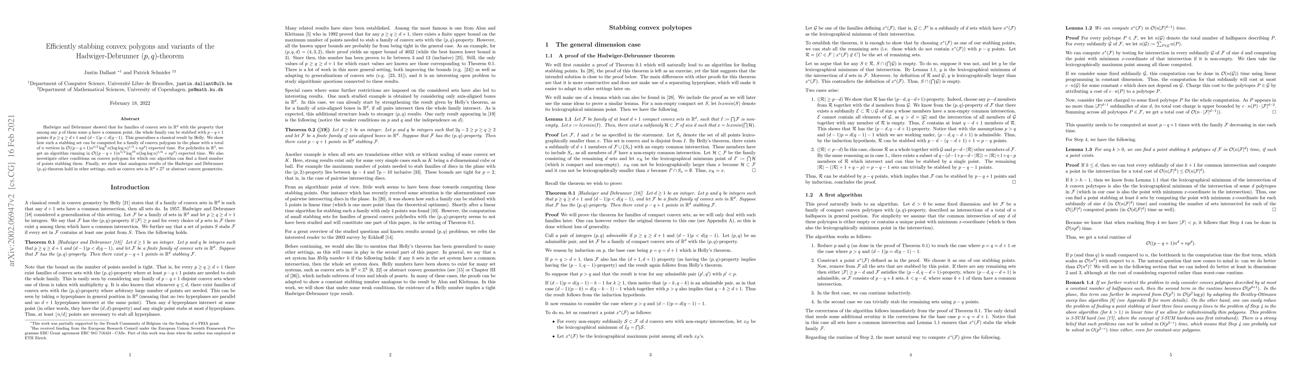 A new algorithm efficiently finds a minimal number of points to stab convex polygons in 2D and polyhedra in 3D, improving upon the Hadwiger-Debrunner theorem with near-linear expected time complexity.