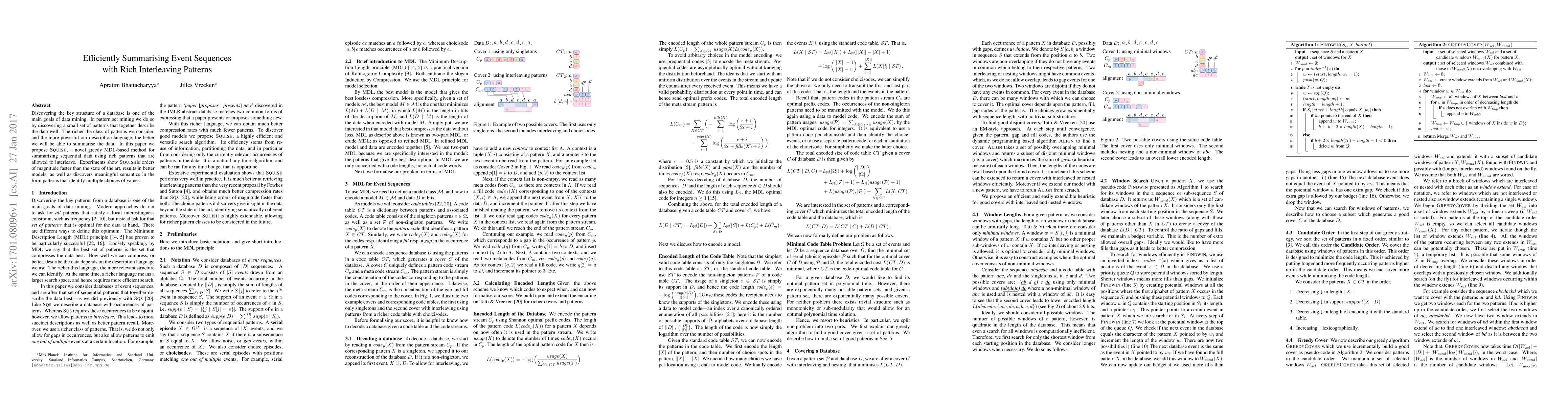 This paper introduces \ourmethod, a novel greedy MDL-based approach for efficiently summarising sequential data with rich interleaving patterns. Experiments demonstrate that \ourmethod is significantly faster than existing methods, produces better models, and uncovers meaningful pattern semantics.