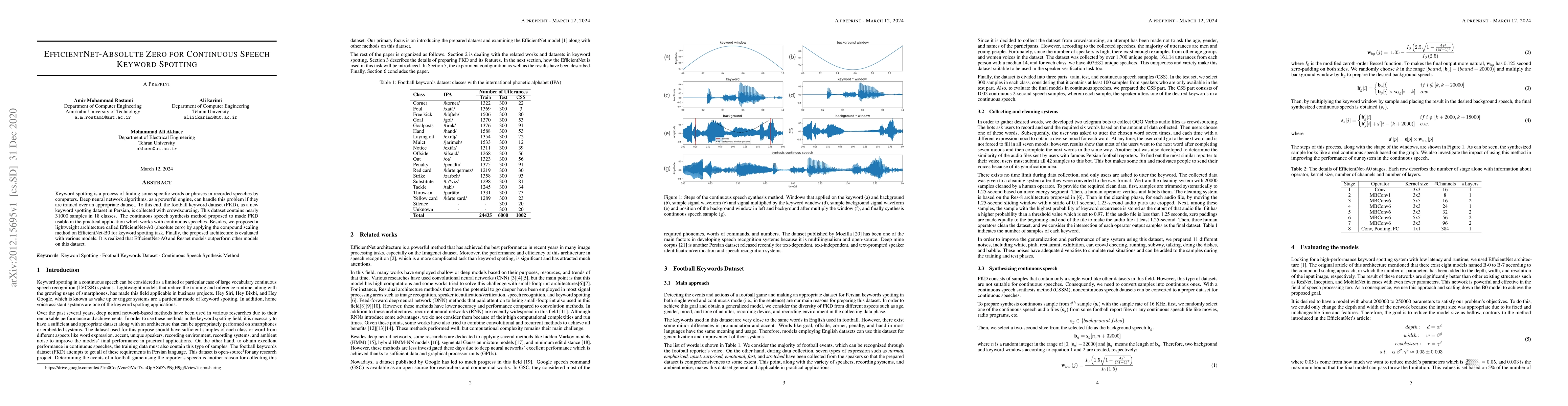 Keyword spotting is a process of finding some specific words or phrases in recorded speeches by computers. Deep neural network algorithms, as a powerful engine, can handle this problem if they are trained over an appropriate dataset. To this end, the football keyword dataset (FKD), as a new keyword spotting dataset in Persian, is collected with crowdsourcing. This dataset contains nearly 31000 samples in 18 classes. The continuous speech synthesis method proposed to made FKD usable in the practical application which works with continuous speeches. Besides, we proposed a lightweight architecture called EfficientNet-A0 (absolute zero) by applying the compound scaling method on EfficientNet-B0 for keyword spotting task. Finally, the proposed architecture is evaluated with various models. It is realized that EfficientNet-A0 and Resnet models outperform other models on this dataset.