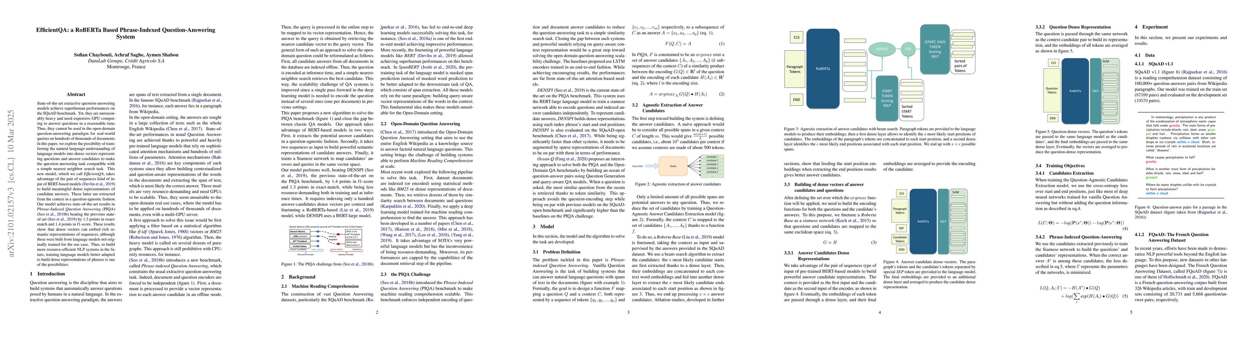 EfficientQA leverages RoBERTa to create dense vectors for questions and answer candidates, enabling efficient nearest neighbor search for question-answering, achieving state-of-the-art results in Phrase-Indexed Question Answering (PIQA) while being more resource-efficient compared to traditional models.