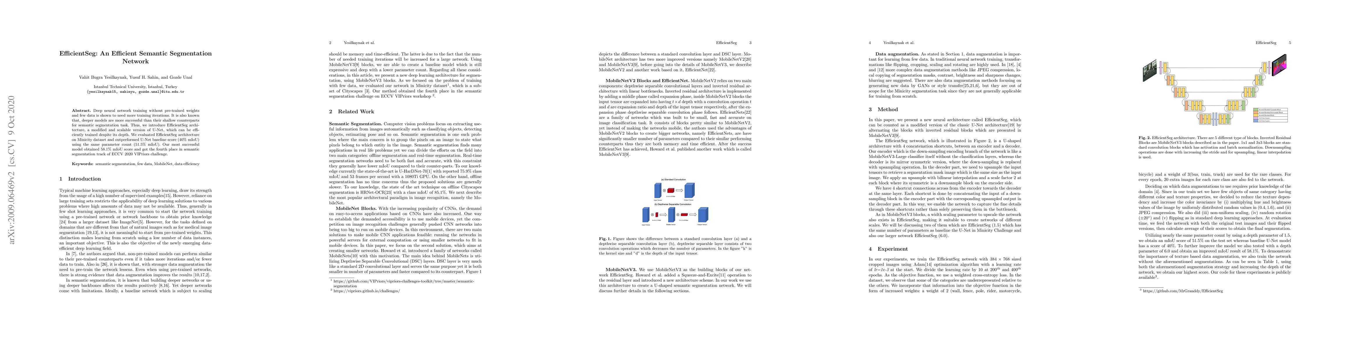 Deep neural network training without pre-trained weights and few data is shown to need more training iterations. It is also known that, deeper models are more successful than their shallow counterparts for semantic segmentation task. Thus, we introduce EfficientSeg architecture, a modified and scalable version of U-Net, which can be efficiently trained despite its depth. We evaluated EfficientSeg architecture on Minicity dataset and outperformed U-Net baseline score (40% mIoU) using the same parameter count (51.5% mIoU). Our most successful model obtained 58.1% mIoU score and got the fourth place in semantic segmentation track of ECCV 2020 VIPriors challenge.