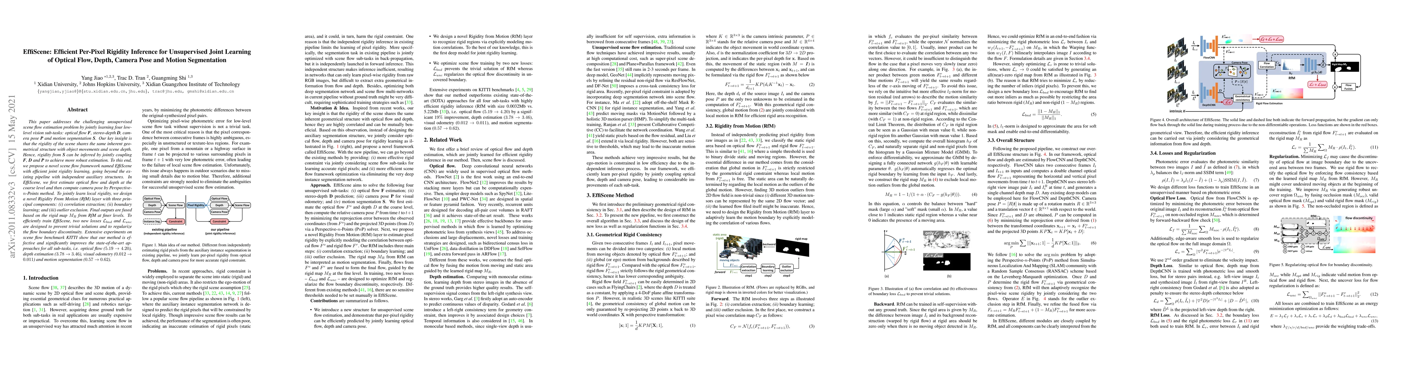 EffiScene proposes an efficient framework for unsupervised joint learning of optical flow, depth, camera pose, and motion segmentation by leveraging the shared geometrical structure of scene rigidity. The method significantly improves state-of-the-art performance on all tasks, demonstrating robust estimation through a novel Rigidity From Motion layer.