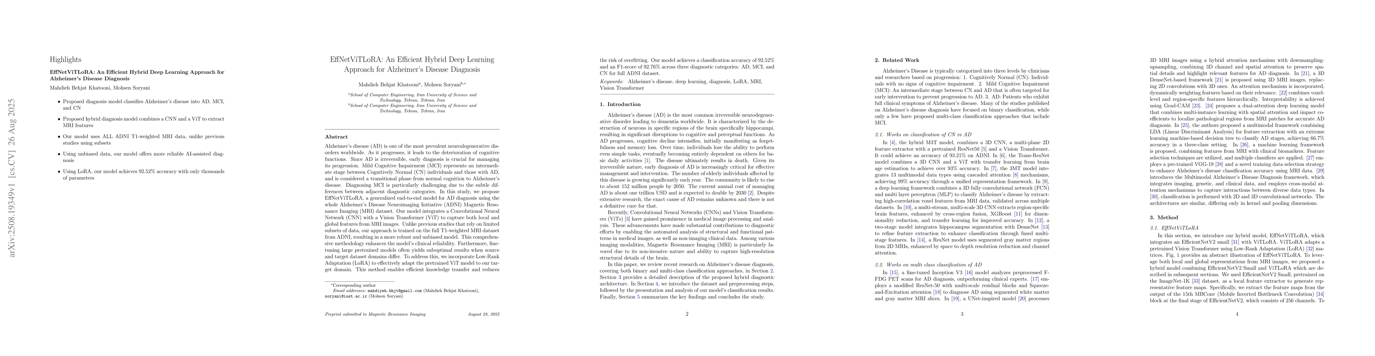 Alzheimer's disease (AD) is one of the most prevalent neurodegenerative disorders worldwide. As it progresses, it leads to the deterioration of cognitive functions. Since AD is irreversible, early diagnosis is crucial for managing its progression. Mild Cognitive Impairment (MCI) represents an intermediate stage between Cognitively Normal (CN) individuals and those with AD, and is considered a transitional phase from normal cognition to Alzheimer's disease. Diagnosing MCI is particularly challenging due to the subtle differences between adjacent diagnostic categories. In this study, we propose EffNetViTLoRA, a generalized end-to-end model for AD diagnosis using the whole Alzheimer's Disease Neuroimaging Initiative (ADNI) Magnetic Resonance Imaging (MRI) dataset. Our model integrates a Convolutional Neural Network (CNN) with a Vision Transformer (ViT) to capture both local and global features from MRI images. Unlike previous studies that rely on limited subsets of data, our approach is trained on the full T1-weighted MRI dataset from ADNI, resulting in a more robust and unbiased model. This comprehensive methodology enhances the model's clinical reliability. Furthermore, fine-tuning large pretrained models often yields suboptimal results when source and target dataset domains differ. To address this, we incorporate Low-Rank Adaptation (LoRA) to effectively adapt the pretrained ViT model to our target domain. This method enables efficient knowledge transfer and reduces the risk of overfitting. Our model achieves a classification accuracy of 92.52% and an F1-score of 92.76% across three diagnostic categories: AD, MCI, and CN for full ADNI dataset.