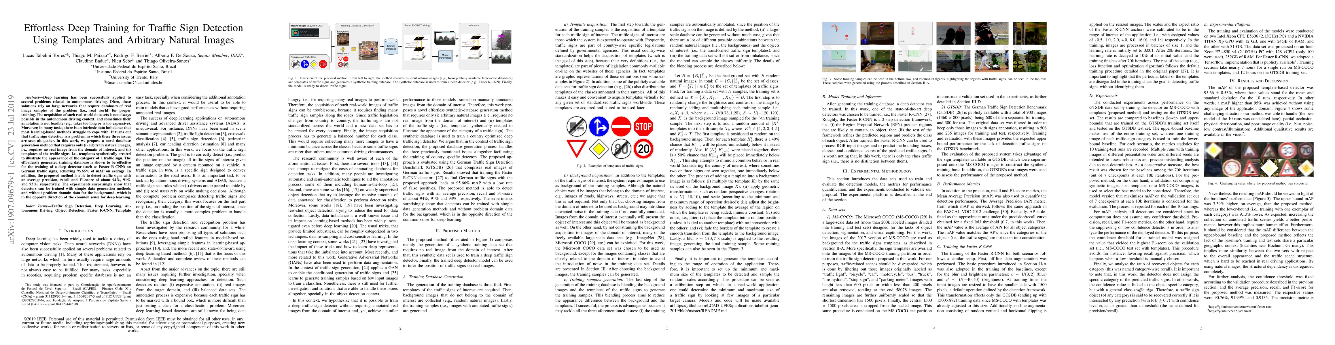 This research paper proposes a novel method for generating training databases for traffic sign detection using only templates of traffic signs and arbitrary natural images, eliminating the need for real-world data. The method successfully trains a deep detector to achieve high accuracy, demonstrating that effective training can be achieved without relying on problem domain-specific background images. For more details, I recommend referring directly to the original paper.