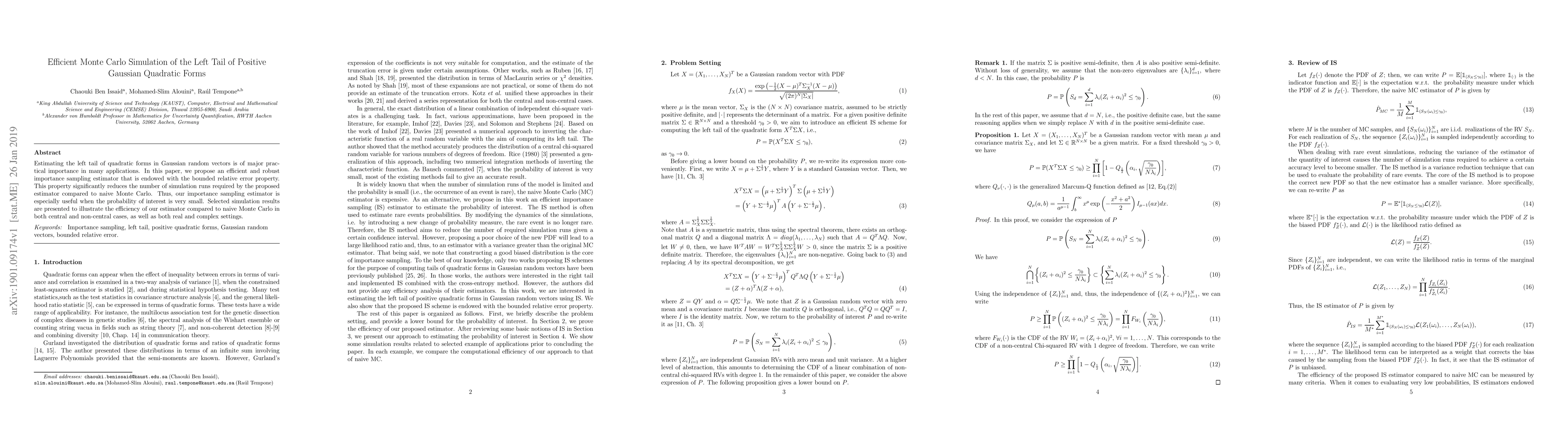 This paper proposes an efficient importance sampling estimator for estimating the left tail of positive Gaussian quadratic forms, which significantly reduces simulation runs compared to naive Monte Carlo, especially for very small probabilities. Simulation results demonstrate its effectiveness in both central and non-central cases, and in real and complex settings.