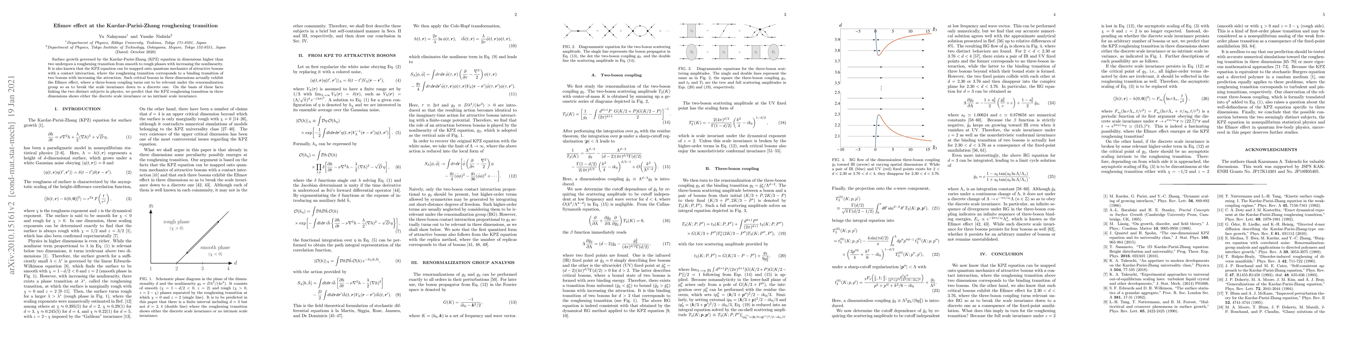 Surface growth governed by the Kardar-Parisi-Zhang (KPZ) equation in dimensions higher than two undergoes a roughening transition from smooth to rough phases with increasing the nonlinearity. It is also known that the KPZ equation can be mapped onto quantum mechanics of attractive bosons with a contact interaction, where the roughening transition corresponds to a binding transition of two bosons with increasing the attraction. Such critical bosons in three dimensions actually exhibit the Efimov effect, where a three-boson coupling turns out to be relevant under the renormalization group so as to break the scale invariance down to a discrete one. On the basis of these facts linking the two distinct subjects in physics, we predict that the KPZ roughening transition in three dimensions shows either the discrete scale invariance or no intrinsic scale invariance.