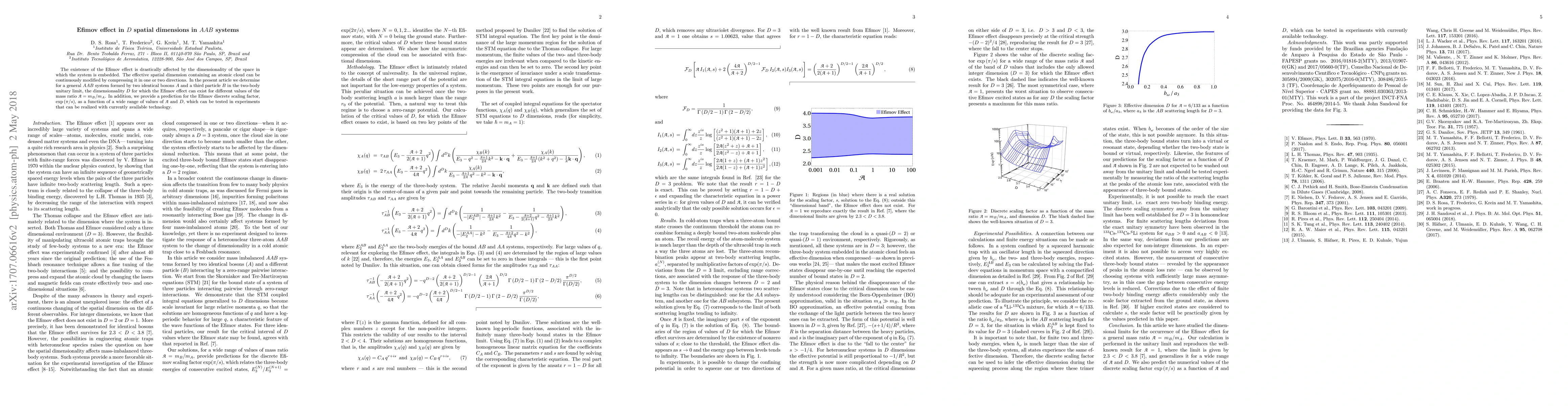 The existence of the Efimov effect is drastically affected by the dimensionality of the space in which the system is embedded. The effective spatial dimension containing an atomic cloud can be continuously modified by compressing it in one or two directions. In the present article we determine for a general $AAB$ system formed by two identical bosons $A$ and a third particle $B$ in the two-body unitary limit, the dimensionsality $D$ for which the Efimov effect can exist for different values of the mass ratio $\mathpzc{A}=m_B/m_A$. In addition, we provide a prediction for the Efimov discrete scaling factor, ${\rm exp}\,(\pi/s)$, as a function of a wide range of values of $\mathpzc{A}$ and $D$, which can be tested in experiments that can be realized with currently available technology.