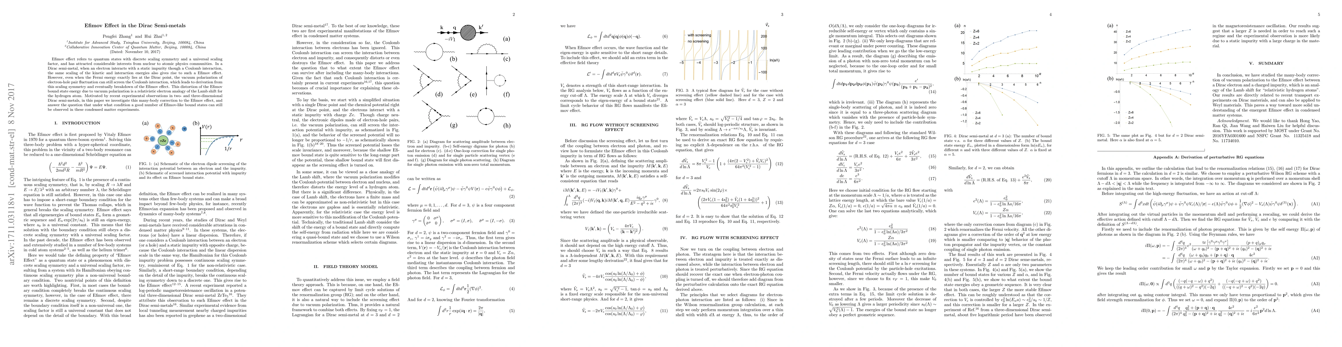 This paper investigates the Efimov effect in Dirac semi-metals, where Coulomb interactions lead to discrete scaling symmetry, but vacuum polarization disrupts this effect. The study explores the conditions under which Efimov-like bound states can still be observed in these materials.