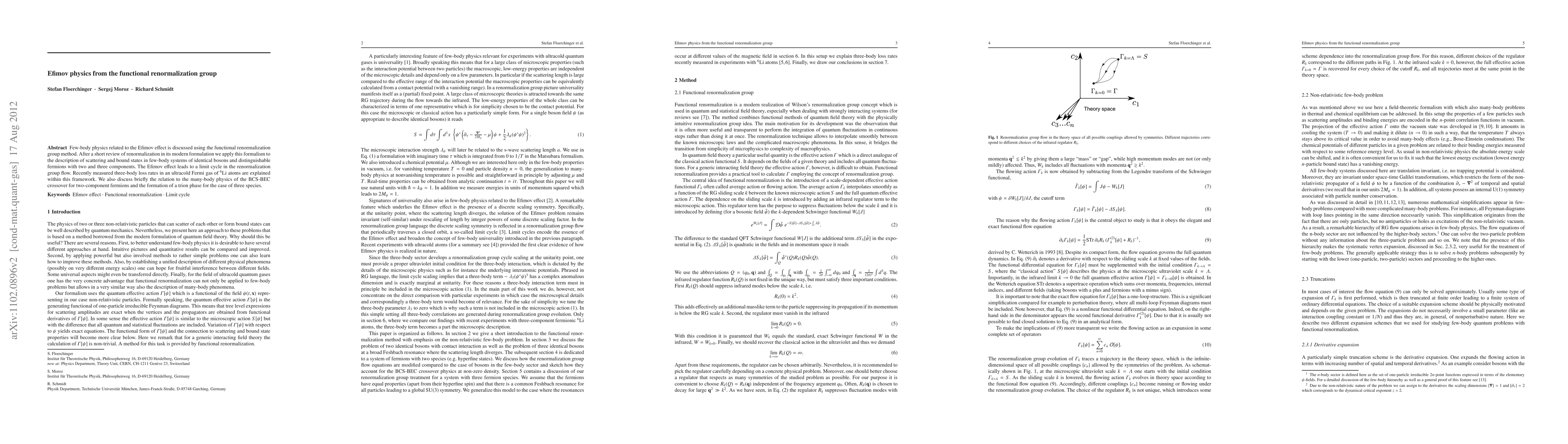 This paper explores the Efimov effect in few-body systems using the functional renormalization group method, demonstrating a limit cycle in the renormalization group flow and explaining recent three-body loss rates in ultracold Fermi gas. It also briefly connects these findings to many-body physics in the BCS-BEC crossover and trion formation.