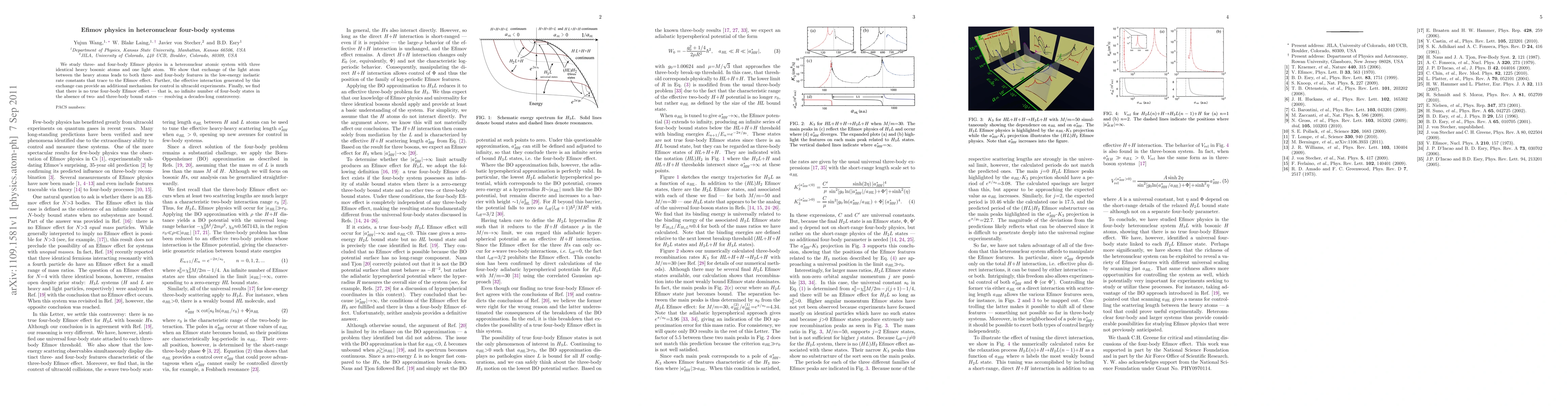 This paper investigates Efimov physics in heteronuclear systems with three heavy bosonic atoms and one light atom, revealing three- and four-body features in low-energy inelastic rates due to light atom exchange. It also resolves the longstanding debate about the existence of a true four-body Efimov effect, concluding there is none.