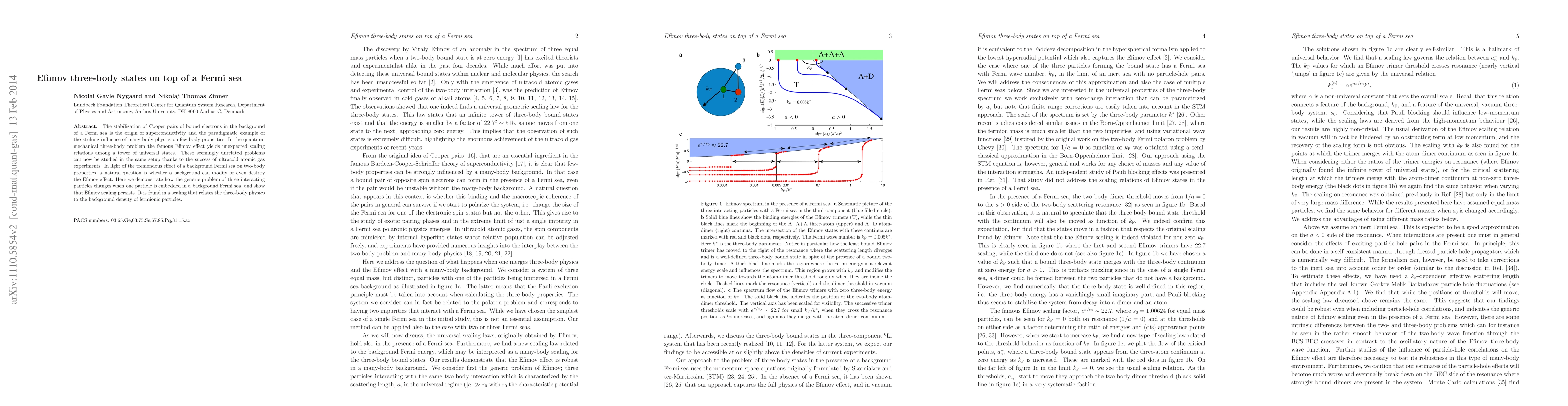 The stabilization of Cooper pairs of bound electrons in the background of a Fermi sea is the origin of superconductivity and the paradigmatic example of the striking influence of many-body physics on few-body properties. In the quantum-mechanical three-body problem the famous Efimov effect yields unexpected scaling relations among a tower of universal states. These seemingly unrelated problems can now be studied in the same setup thanks to the success of ultracold atomic gas experiments. In light of the tremendous effect of a background Fermi sea on two-body properties, a natural question is whether a background can modify or even destroy the Efimov effect. Here we demonstrate how the generic problem of three interacting particles changes when one particle is embedded in a background Fermi sea, and show that Efimov scaling persists. It is found in a scaling that relates the three-body physics to the background density of fermionic particles.