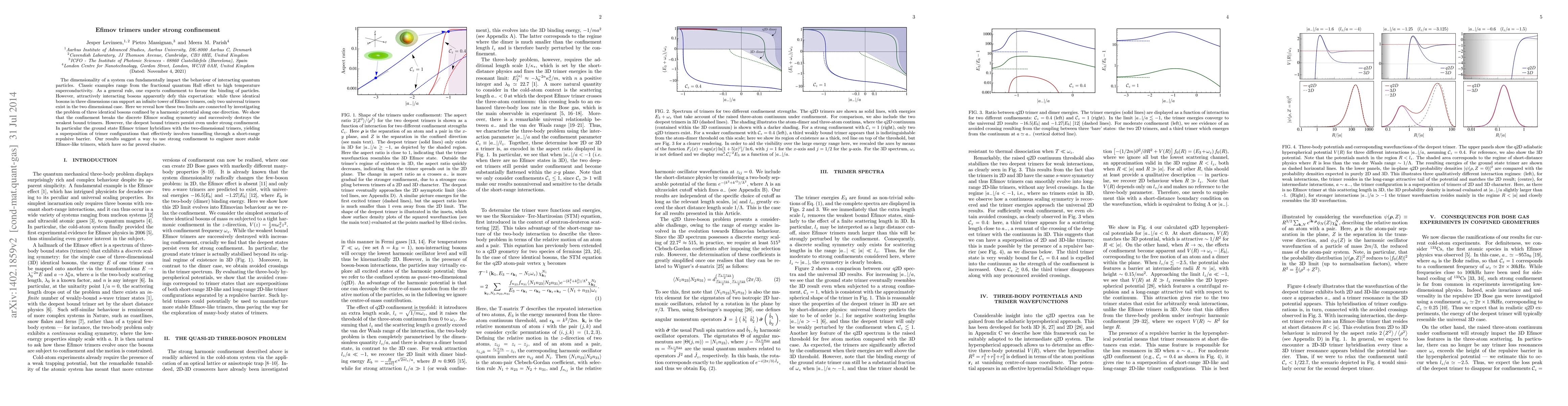 The dimensionality of a system can fundamentally impact the behaviour of interacting quantum particles. Classic examples range from the fractional quantum Hall effect to high temperature superconductivity. As a general rule, one expects confinement to favour the binding of particles. However, attractively interacting bosons apparently defy this expectation: while three identical bosons in three dimensions can support an infinite tower of Efimov trimers, only two universal trimers exist in the two dimensional case. We reveal how these two limits are connected by investigating the problem of three identical bosons confined by a harmonic potential along one direction. We show that the confinement breaks the discrete Efimov scaling symmetry and destroys the weakest bound trimers. However, the deepest bound Efimov trimer persists under strong confinement and hybridizes with the quasi-two-dimensional trimers, yielding a superposition of trimer configurations that effectively involves tunnelling through a short-range repulsive barrier. Our results suggest a way to use strong confinement to engineer more stable Efimov-like trimers, which have so far proved elusive.