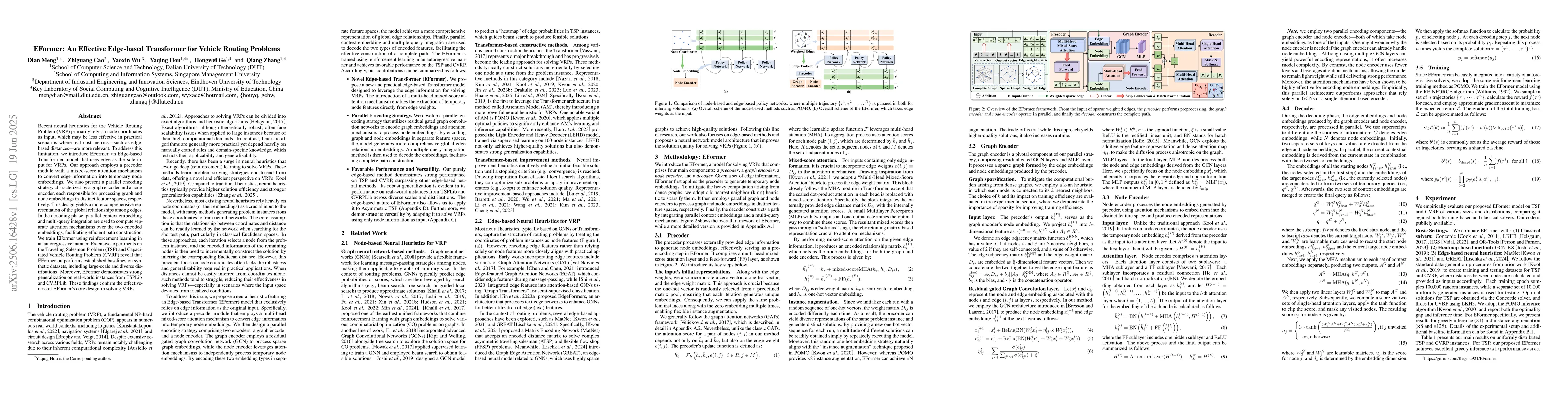 The research introduces EFormer, an Edge-based Transformer model for Vehicle Routing Problems (VRP). EFormer uses edge distances as input, employing a precoder and mixed-score attention for temporary node embeddings. It features parallel encoding via graph and node encoders, and efficient path construction via context embedding and multi-query integration. Trained with reinforcement learning, EFormer outperforms baselines on synthetic datasets and shows strong generalization on real-world TSPLib and CVRPLib instances, confirming its effectiveness in solving VRPs.