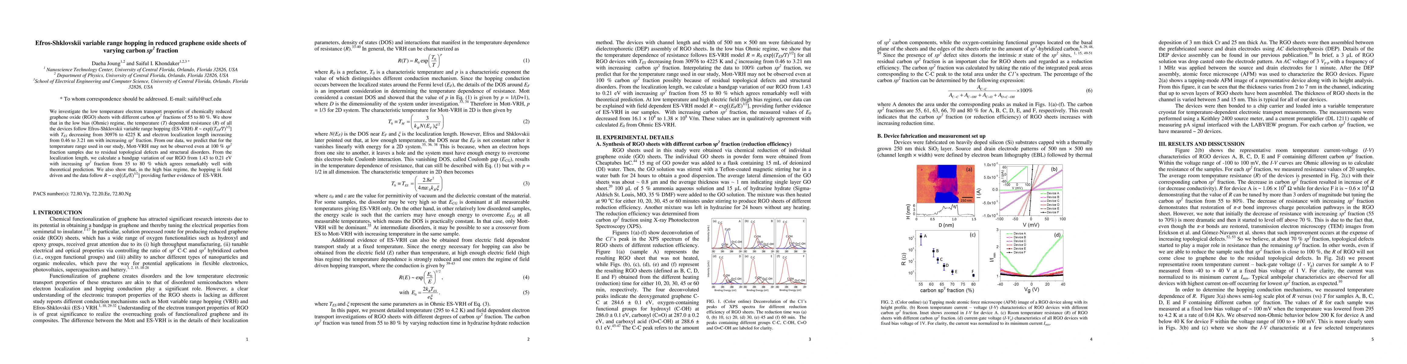 This study examines the electron transport in reduced graphene oxide sheets with varying carbon sp2 fractions, finding that Efros-Shklovskii variable range hopping governs the low-temperature resistance behavior, with the electron localization length and bandgap decreasing with increasing sp2 fraction. The results suggest that even at 100% sp2 fraction, Mott-VRH may not be observed due to structural defects.
