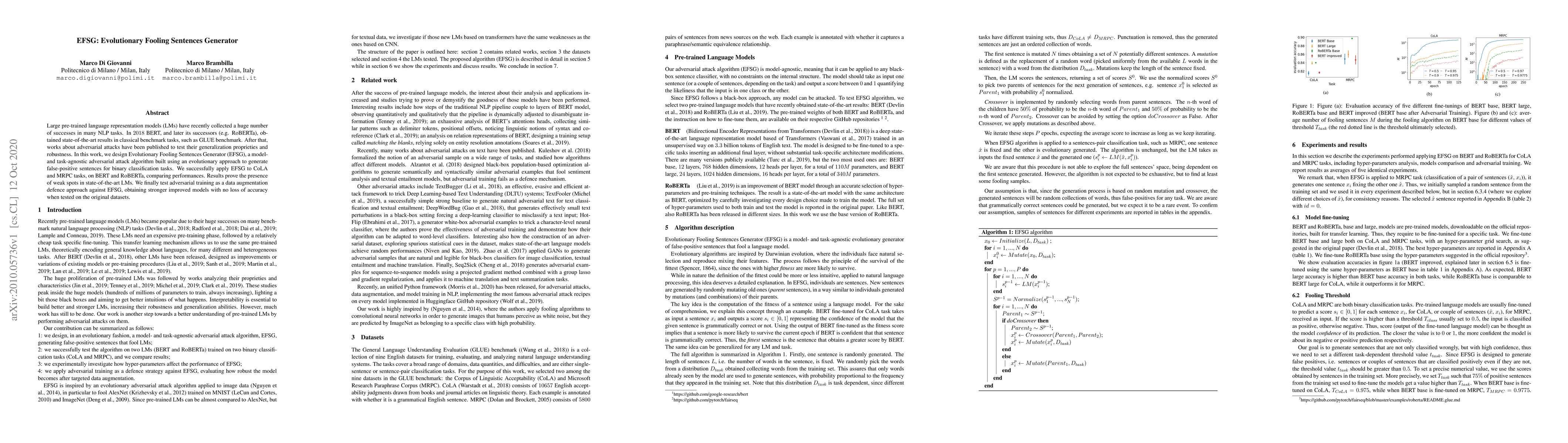 Large pre-trained language representation models (LMs) have recently collected a huge number of successes in many NLP tasks. In 2018 BERT, and later its successors (e.g. RoBERTa), obtained state-of-the-art results in classical benchmark tasks, such as GLUE benchmark. After that, works about adversarial attacks have been published to test their generalization proprieties and robustness. In this work, we design Evolutionary Fooling Sentences Generator (EFSG), a model- and task-agnostic adversarial attack algorithm built using an evolutionary approach to generate false-positive sentences for binary classification tasks. We successfully apply EFSG to CoLA and MRPC tasks, on BERT and RoBERTa, comparing performances. Results prove the presence of weak spots in state-of-the-art LMs. We finally test adversarial training as a data augmentation defence approach against EFSG, obtaining stronger improved models with no loss of accuracy when tested on the original datasets.