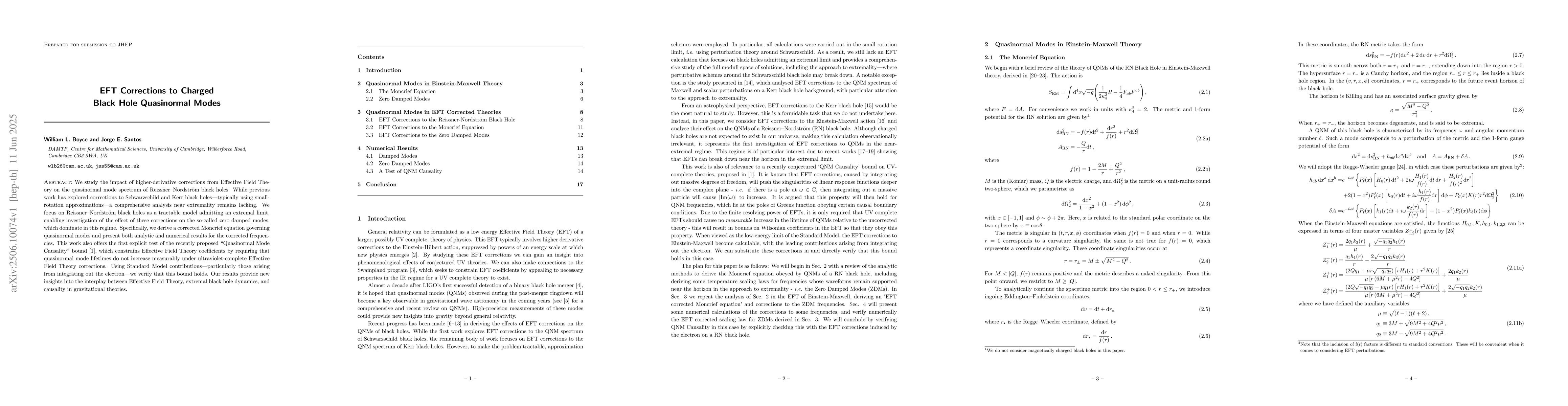 We study the impact of higher-derivative corrections from Effective Field Theory on the quasinormal mode spectrum of Reissner-Nordstr\"om black holes. While previous work has explored corrections to Schwarzschild and Kerr black holes - typically using small-rotation approximations - a comprehensive analysis near extremality remains lacking. We focus on Reissner-Nordstr\"om black holes as a tractable model admitting an extremal limit, enabling investigation of the effect of these corrections on the so-called zero damped modes, which dominate in this regime. Specifically, we derive a corrected Moncrief equation governing quasinormal modes and present both analytic and numerical results for the corrected frequencies. This work also offers the first explicit test of the recently proposed "Quasinormal Mode Causality" bound arXiv:2401.05524, which constrains Effective Field Theory coefficients by requiring that quasinormal mode lifetimes do not increase measurably under ultraviolet-complete Effective Field Theory corrections. Using Standard Model contributions - particularly those arising from integrating out the electron - we verify that this bound holds. Our results provide new insights into the interplay between Effective Field Theory, extremal black hole dynamics, and causality in gravitational theories.