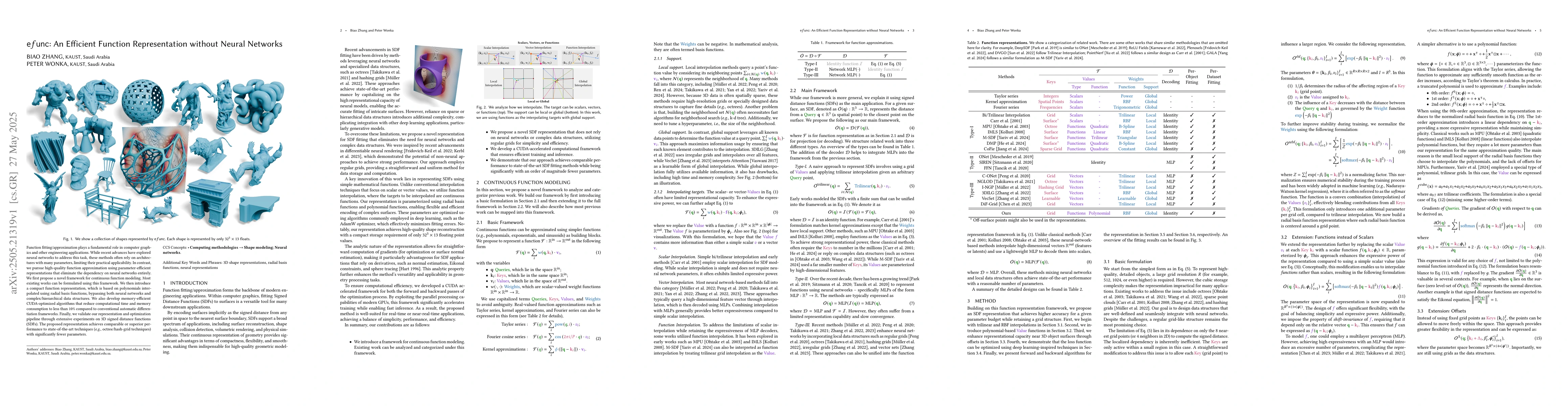 Function fitting/approximation plays a fundamental role in computer graphics and other engineering applications. While recent advances have explored neural networks to address this task, these methods often rely on architectures with many parameters, limiting their practical applicability. In contrast, we pursue high-quality function approximation using parameter-efficient representations that eliminate the dependency on neural networks entirely. We first propose a novel framework for continuous function modeling. Most existing works can be formulated using this framework. We then introduce a compact function representation, which is based on polynomials interpolated using radial basis functions, bypassing both neural networks and complex/hierarchical data structures. We also develop memory-efficient CUDA-optimized algorithms that reduce computational time and memory consumption to less than 10% compared to conventional automatic differentiation frameworks. Finally, we validate our representation and optimization pipeline through extensive experiments on 3D signed distance functions (SDFs). The proposed representation achieves comparable or superior performance to state-of-the-art techniques (e.g., octree/hash-grid techniques) with significantly fewer parameters.