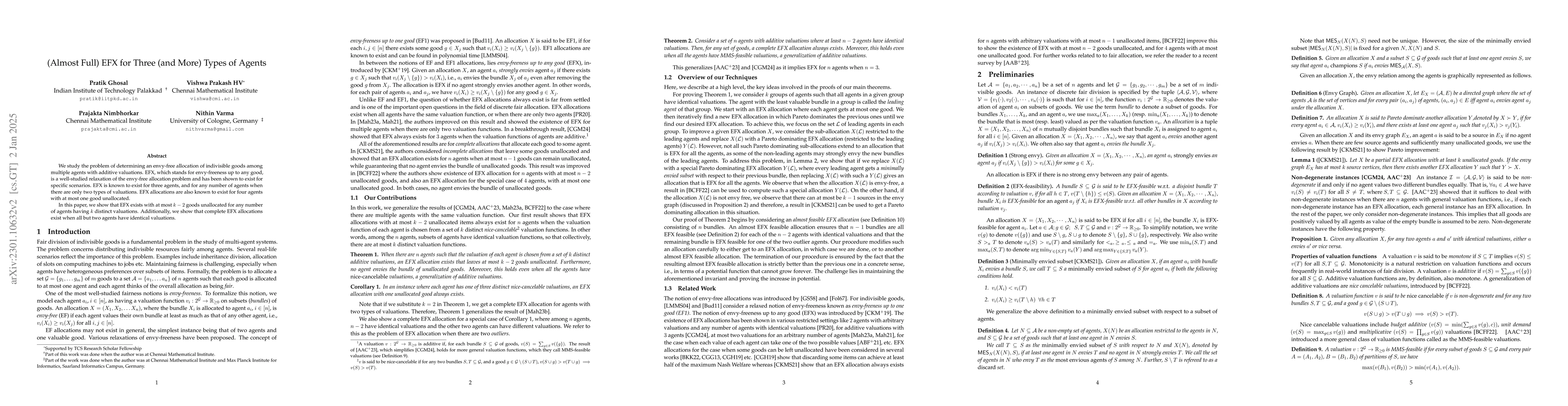 In this paper, we address the problem of determining an envy-free allocation of indivisible goods among multiple agents. EFX, which stands for envy-free up to any good, is a well-studied problem that has been shown to exist for specific scenarios, such as when there are only three agents with MMS valuations, as demonstrated by Chaudhury et al(2020), and for any number of agents when there are only two types of valuations as shown by Mahara(2020). Our contribution is to extend these results by showing that EFX exists for four agents with three distinct valuations. We further generalize this to show the existance of EFX allocations for n agents when n-2 of them have identical valuations.