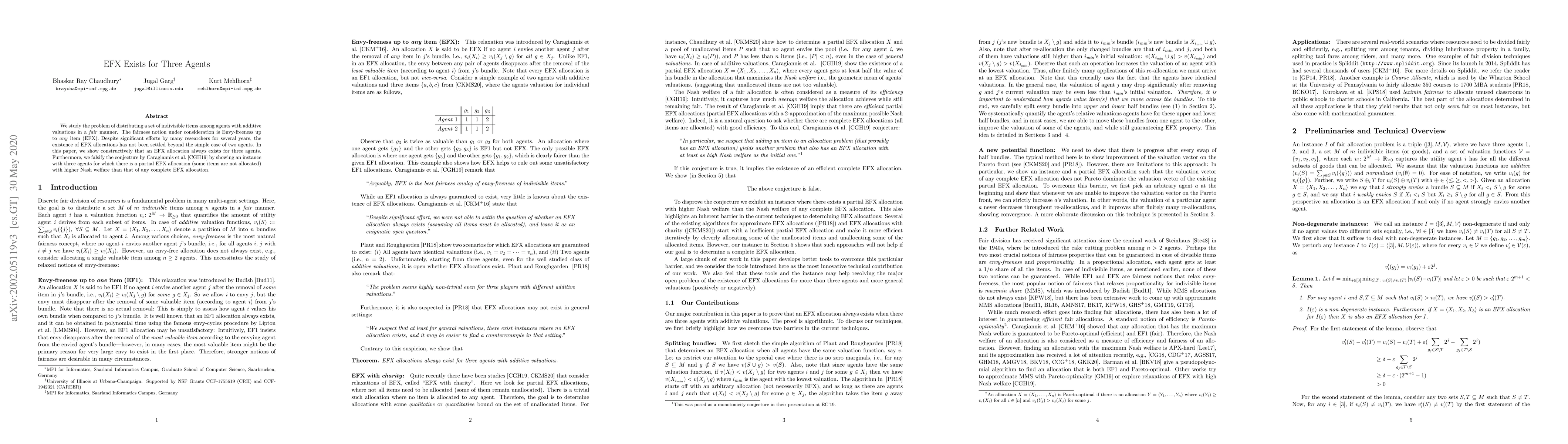 This paper demonstrates that Envy-freeness up to any item (EFX) allocations always exist for three agents, resolving the longstanding open question beyond the two-agent case. It also disproves a conjecture by showing a scenario where a partial EFX allocation achieves higher Nash welfare than any complete EFX allocation.