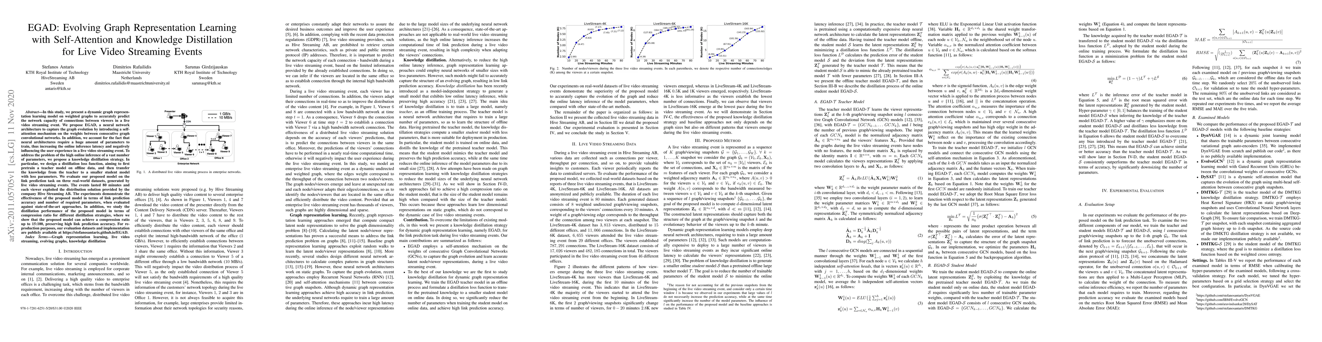 In this study, we present a dynamic graph representation learning model on weighted graphs to accurately predict the network capacity of connections between viewers in a live video streaming event. We propose EGAD, a neural network architecture to capture the graph evolution by introducing a self-attention mechanism on the weights between consecutive graph convolutional networks. In addition, we account for the fact that neural architectures require a huge amount of parameters to train, thus increasing the online inference latency and negatively influencing the user experience in a live video streaming event. To address the problem of the high online inference of a vast number of parameters, we propose a knowledge distillation strategy. In particular, we design a distillation loss function, aiming to first pretrain a teacher model on offline data, and then transfer the knowledge from the teacher to a smaller student model with less parameters. We evaluate our proposed model on the link prediction task on three real-world datasets, generated by live video streaming events. The events lasted 80 minutes and each viewer exploited the distribution solution provided by the company Hive Streaming AB. The experiments demonstrate the effectiveness of the proposed model in terms of link prediction accuracy and number of required parameters, when evaluated against state-of-the-art approaches. In addition, we study the distillation performance of the proposed model in terms of compression ratio for different distillation strategies, where we show that the proposed model can achieve a compression ratio up to 15:100, preserving high link prediction accuracy. For reproduction purposes, our evaluation datasets and implementation are publicly available at https://stefanosantaris.github.io/EGAD.