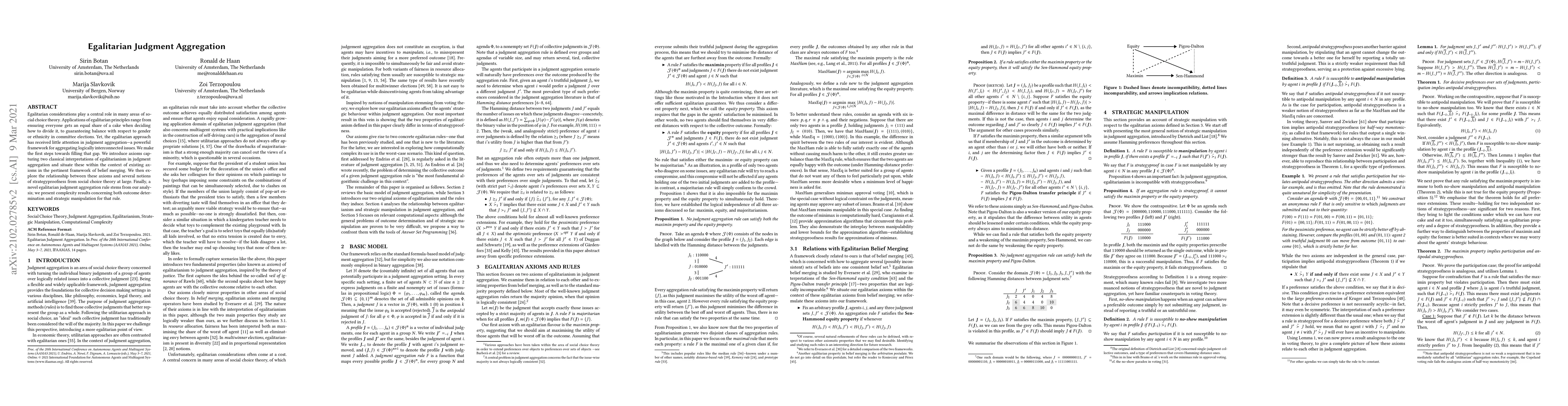 Egalitarian considerations play a central role in many areas of social choice theory. Applications of egalitarian principles range from ensuring everyone gets an equal share of a cake when deciding how to divide it, to guaranteeing balance with respect to gender or ethnicity in committee elections. Yet, the egalitarian approach has received little attention in judgment aggregation -- a powerful framework for aggregating logically interconnected issues. We make the first steps towards filling that gap. We introduce axioms capturing two classical interpretations of egalitarianism in judgment aggregation and situate these within the context of existing axioms in the pertinent framework of belief merging. We then explore the relationship between these axioms and several notions of strategyproofness from social choice theory at large. Finally, a novel egalitarian judgment aggregation rule stems from our analysis; we present complexity results concerning both outcome determination and strategic manipulation for that rule.