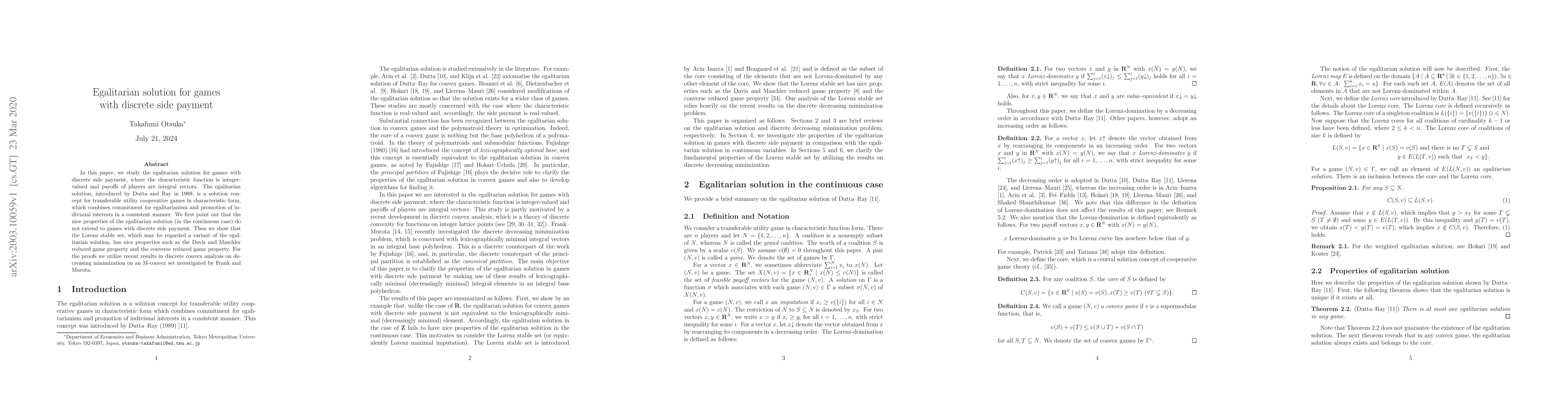 This paper explores the egalitarian solution for cooperative games involving discrete side payments, highlighting that properties of the egalitarian solution in continuous games do not extend to discrete cases. It introduces the Lorenz stable set as a variant with desirable properties, supported by recent results in discrete convex analysis.