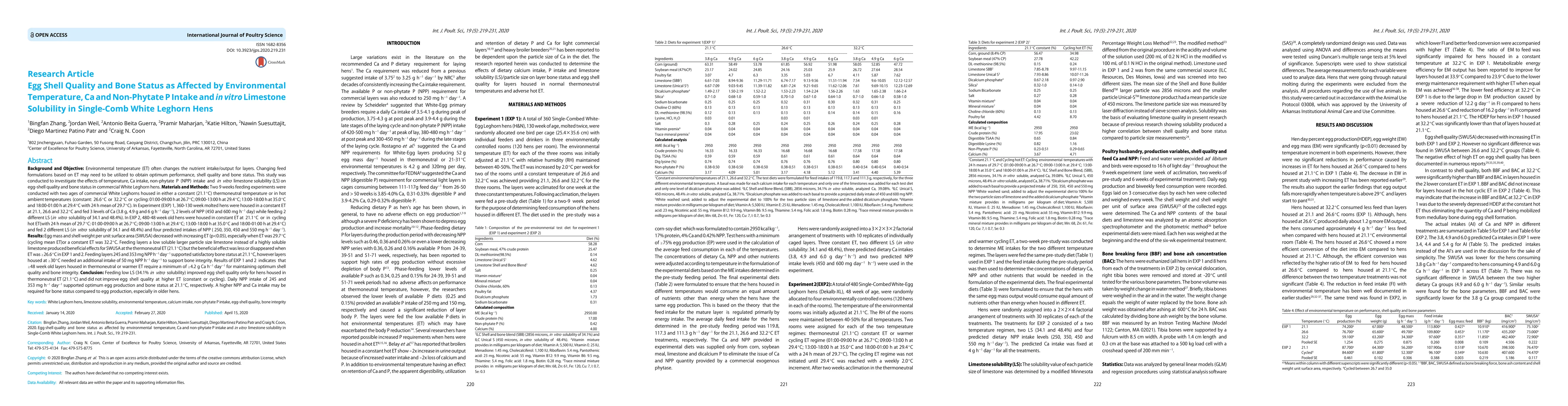 Environmental temperature (ET) often changes the nutrient intake/output for layers. Changing feed formulations based on ET may need to be utilized to obtain optimum performance, shell quality and bone status. This study was conducted to investigate the effects of temperature, Ca intake, non-phytate P (NPP) intake and in vitro limestone solubility (LS) on egg-shell quality and bone status in commercial White Leghorn hens. Egg mass and shell weight per unit surface area (SWUSA) decreased with increasing ET (p lower than 0.05), especially when ET was 29.7 C (cycling mean ET)or a constant ET was 32.2 C. Feeding layers a low soluble larger particle size limestone instead of a highly soluble limestone produced beneficial effects for SWUSA at the thermoneutral ET (21.1 C) but the beneficial effect was less or disappeared when ET was higher than 26.6 C in EXP 1 and 2. Feeding layers 245 and 353 mg NPP/h/d supported satisfactory bone status at 21.1 C, however layers housed at higher than 30 C needed an additional intake of 50 mg NPP/h/d to support bone integrity. Results of EXP 1 and 2 indicates that 48 week old layers housed in thermoneutral or warmer ET require a minimum of 4.2 g Ca/h/d for maintaining optimum shell quality and bone integrity. Feeding low LS (34.1% in vitro solubility) improved egg shell quality only for hens housed in thermoneutral ET (21.1 C) and did not improve egg shell quality at higher ET (constant or cycling). Daily NPP intake of 245 and 353 mg/h/d supported optimum egg production and bone status at 21.1 C, respectively. A higher NPP and Ca intake may be required for bone status compared to egg production, especially in older hens.