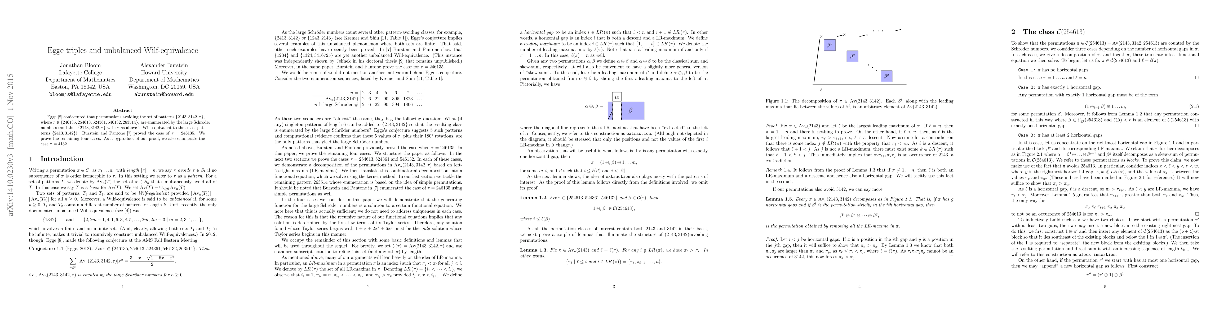 Egge conjectured that permutations avoiding the set of patterns $\{2143,3142,\tau\}$, where $\tau\in\{246135,254613,263514,524361,546132\}$, are enumerated by the large Schr\"oder numbers. Consequently, $\{2143,3142,\tau\}$ with $\tau$ as above is Wilf-equivalent to the set of patterns $\{2413,3142\}$. Burstein and Pantone proved the case of $\tau=246135$. We prove the remaining four cases. As a byproduct of our proof, we also enumerate the case $\tau=4132$.