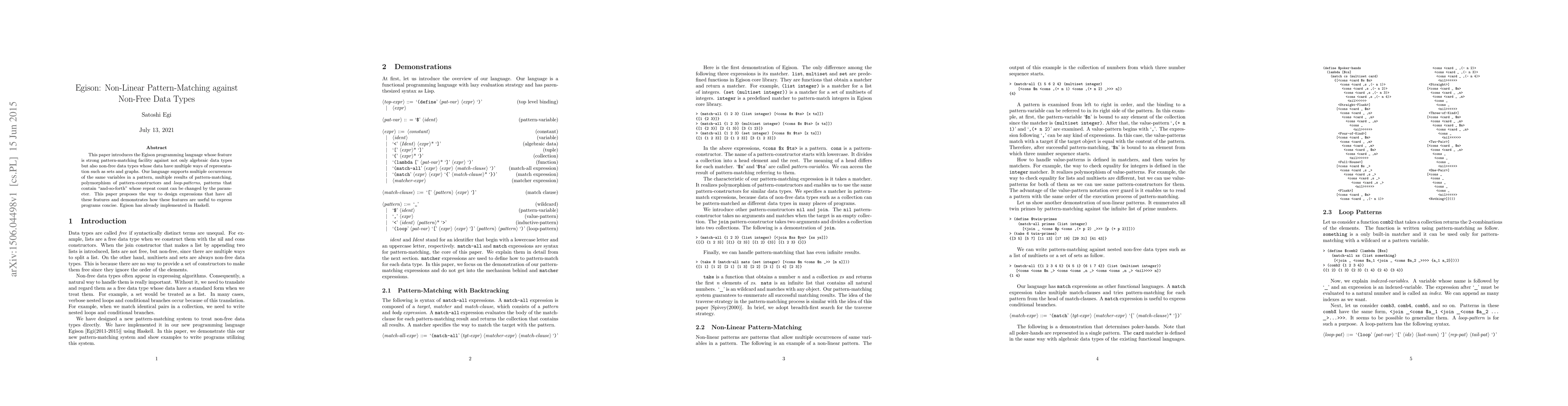 Summary: Egison is a novel programming language with advanced pattern-matching capabilities for both algebraic and non-free data types, including sets and graphs. It supports complex pattern structures, polymorphism, and dynamic repetition, enabling concise and expressive program design. The language has been implemented in Haskell.
