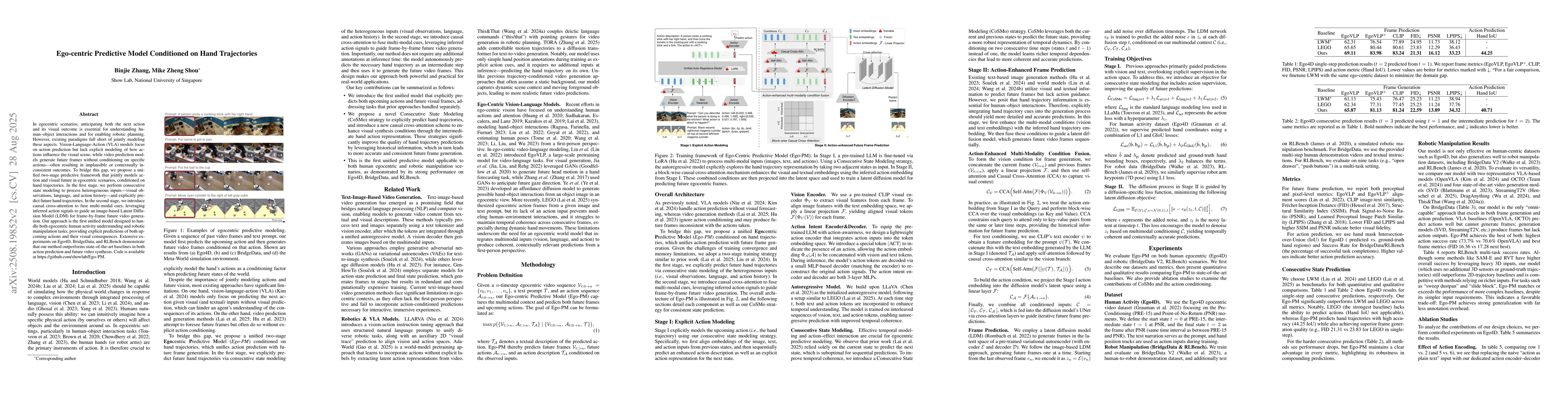 In egocentric scenarios, anticipating both the next action and its visual outcome is essential for understanding human-object interactions and for enabling robotic planning. However, existing paradigms fall short of jointly modeling these aspects. Vision-Language-Action (VLA) models focus on action prediction but lack explicit modeling of how actions influence the visual scene, while video prediction models generate future frames without conditioning on specific actions, often resulting in implausible or contextually inconsistent outcomes. To bridge this gap, we propose a unified two-stage predictive framework that jointly models action and visual future in egocentric scenarios, conditioned on hand trajectories. In the first stage, we perform consecutive state modeling to process heterogeneous inputs (visual observations, language, and action history) and explicitly predict future hand trajectories. In the second stage, we introduce causal cross-attention to fuse multi-modal cues, leveraging inferred action signals to guide an image-based Latent Diffusion Model (LDM) for frame-by-frame future video generation. Our approach is the first unified model designed to handle both egocentric human activity understanding and robotic manipulation tasks, providing explicit predictions of both upcoming actions and their visual consequences. Extensive experiments on Ego4D, BridgeData, and RLBench demonstrate that our method outperforms state-of-the-art baselines in both action prediction and future video synthesis.