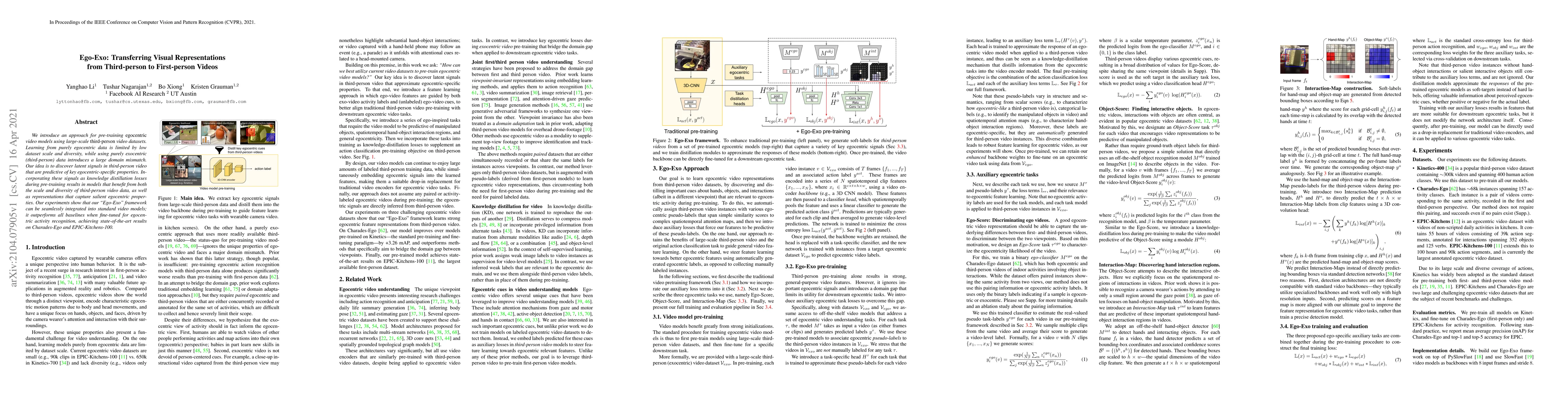 The Ego-Exo framework pre-trains egocentric video models using third-person video datasets, leveraging knowledge distillation to bridge domain gaps. This approach achieves state-of-the-art results in egocentric activity recognition on Charades-Ego and EPIC-Kitchens-100.
