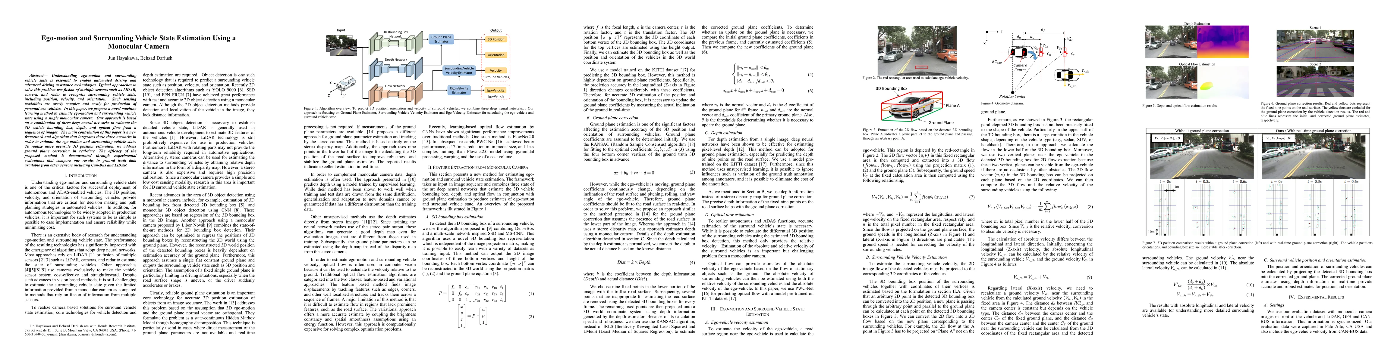 This paper proposes a novel machine learning method using a single monocular camera to estimate ego-motion and surrounding vehicle state, employing three deep neural networks to achieve 3D vehicle bounding box, depth, and optical flow estimation. The integrated framework demonstrates improved accuracy through real-time ground plane correction and is validated against ground truth data from Can-Bus and LiDAR.
