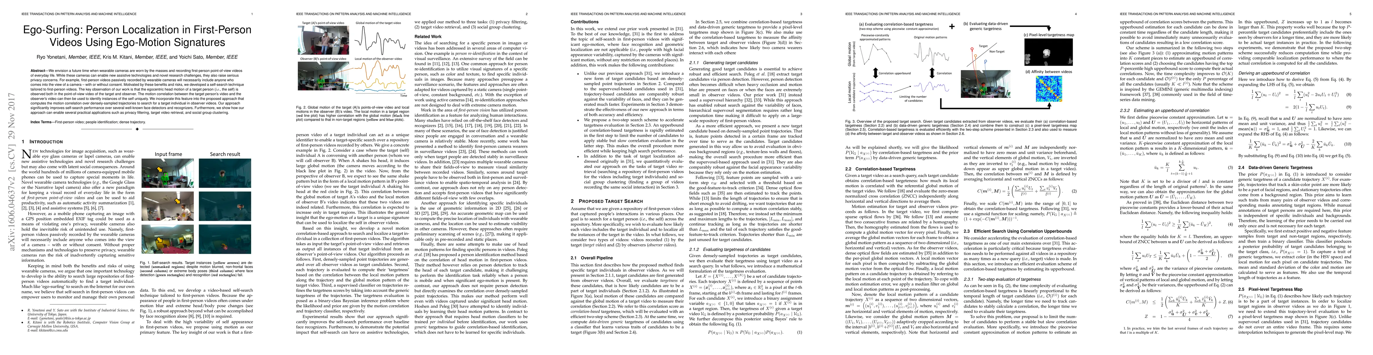 The paper introduces a novel correlation-based approach for self-search in first-person videos, utilizing ego-motion signatures to localize target individuals without facial recognition. It employs trajectory-based target candidates and an upper bound estimation of correlation scores to efficiently limit the number of candidates for correlation-based targetness evaluation.