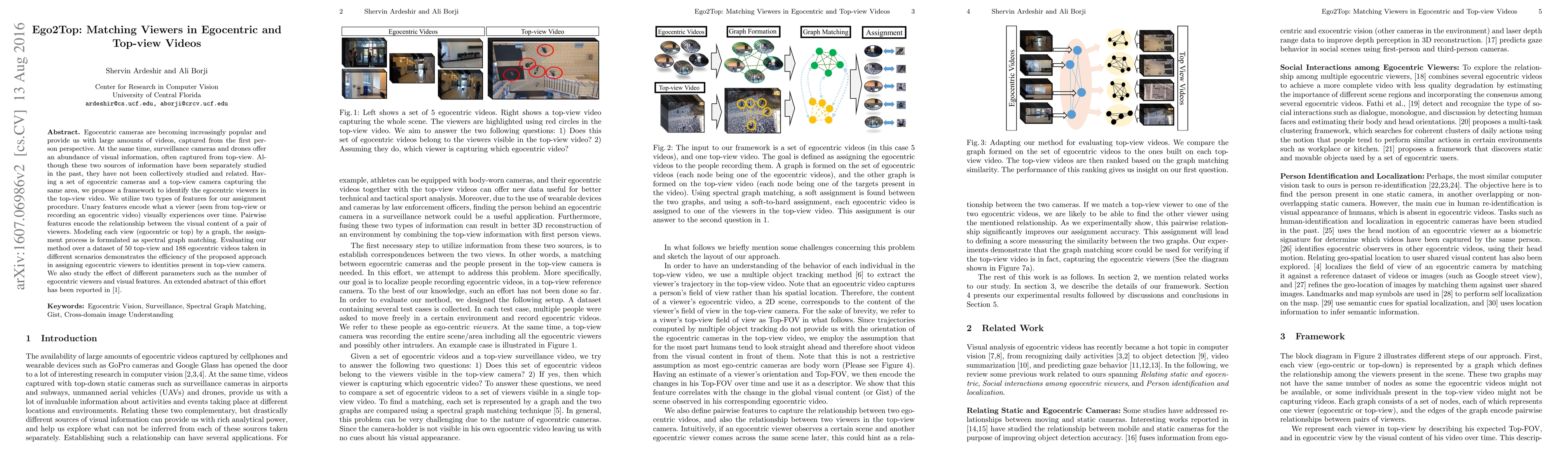 The paper proposes a framework to match viewers in egocentric and top-view videos using spectral graph matching, employing unary and pairwise features to identify egocentric viewers in top-view footage. The method's effectiveness is demonstrated through evaluation on a dataset, showing successful viewer assignment across different scenarios.